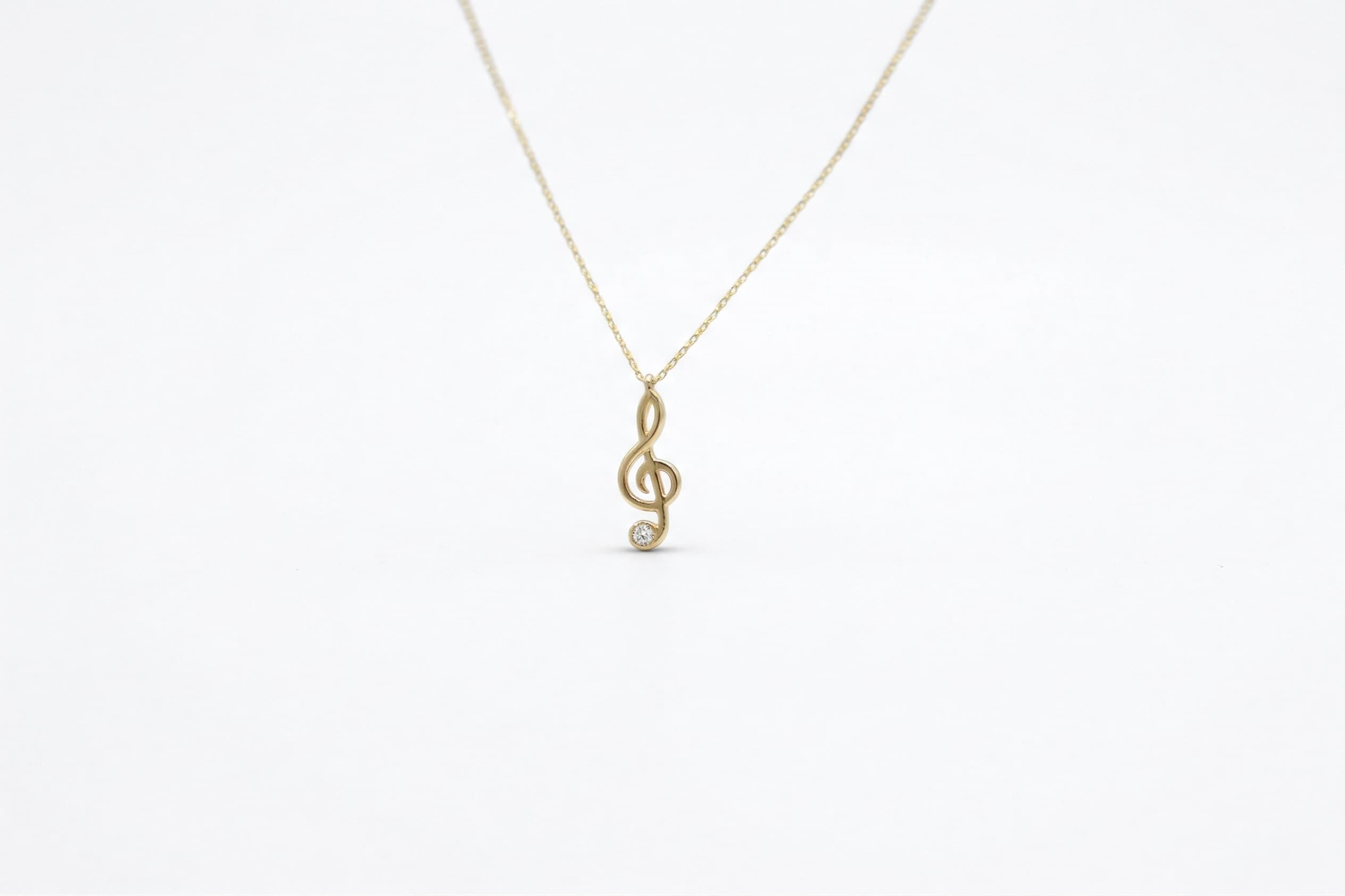 Celeste Serisi 14 ayar altın sol anahtarı kolye olan Venüs Melody, zarif tasarımı ve sanatsal sembolüyle dikkat çeken özel bir takıdır. 14 ayar altın olarak üretilen bu model, müzik notasının estetik formu ve tek taş detayı sayesinde hem modern hem de asil bir görünüm sunar.