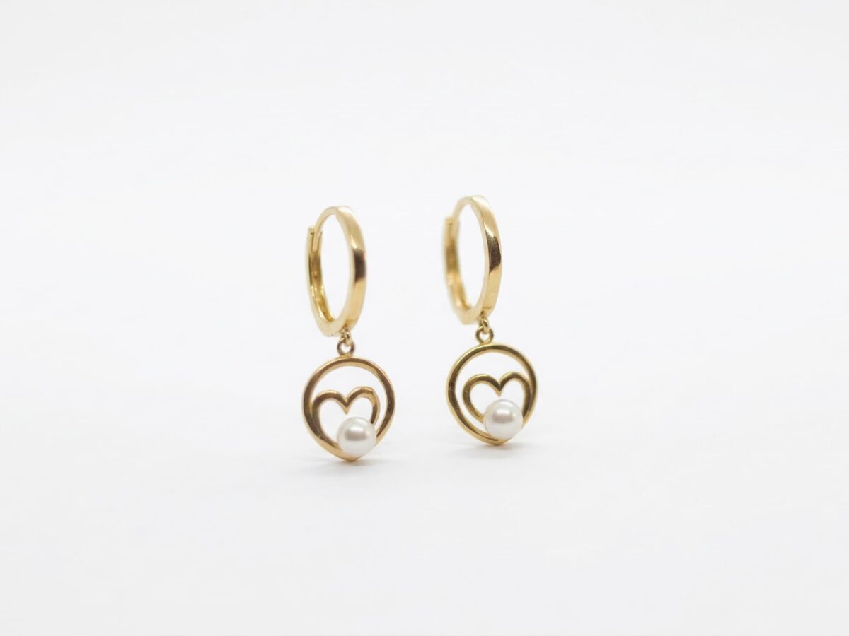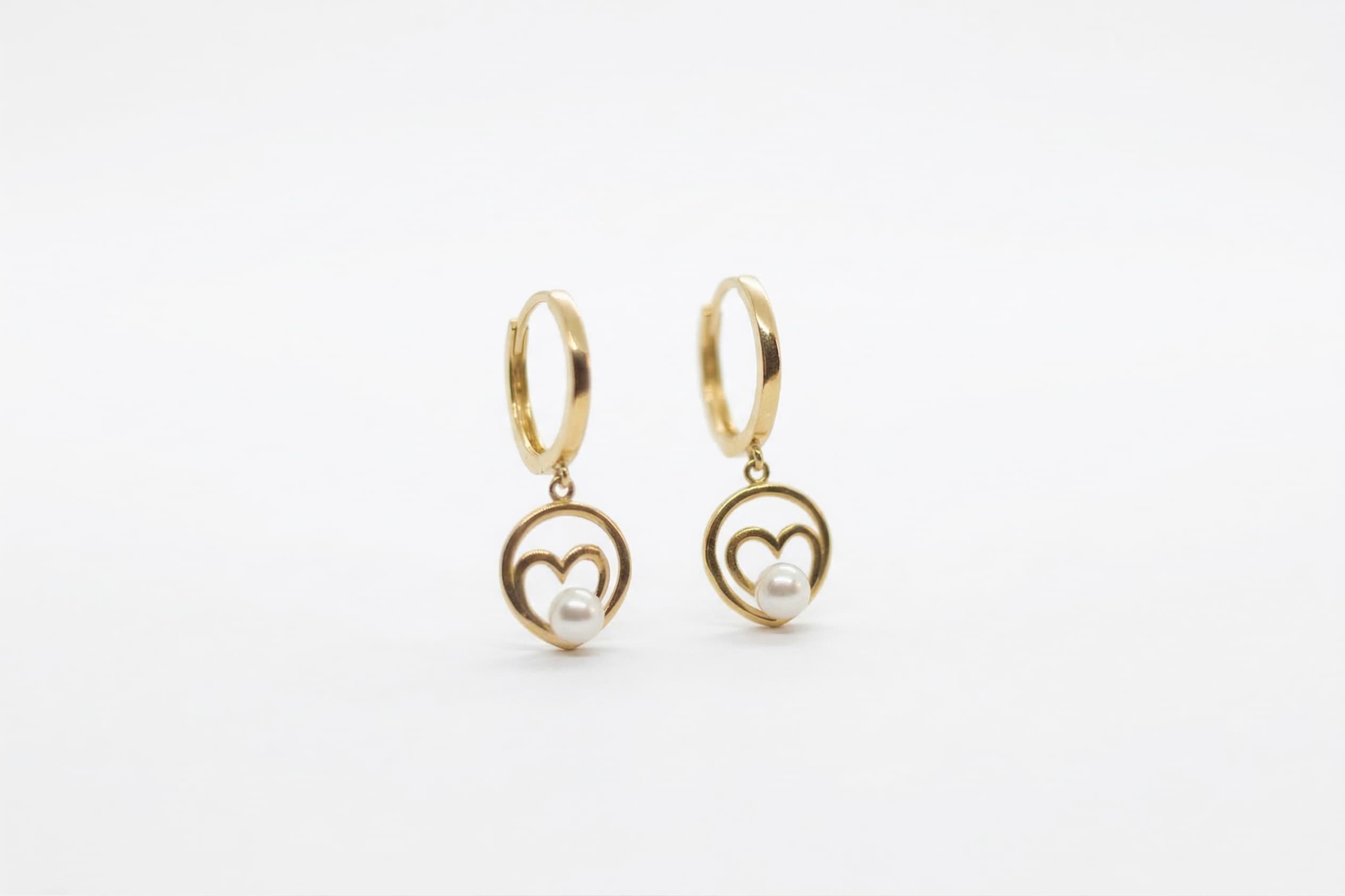 Amour Serisi‘nden bu 14 ayar incili kalp altın küpe, aşkı ve zarafeti tek bir tasarımda buluşturur. “Amour Perle”, Fransızcada “inci aşkı” anlamına gelir; bu küpede de tam olarak o romantik, narin ve duygusal his kendini gösterir. İnce altın halkanın ucundan sallanan daire çerçeve içindeki kalp motifi ve ortasına yerleştirilmiş parlak inci, her bakışta yeni bir anlam taşır.