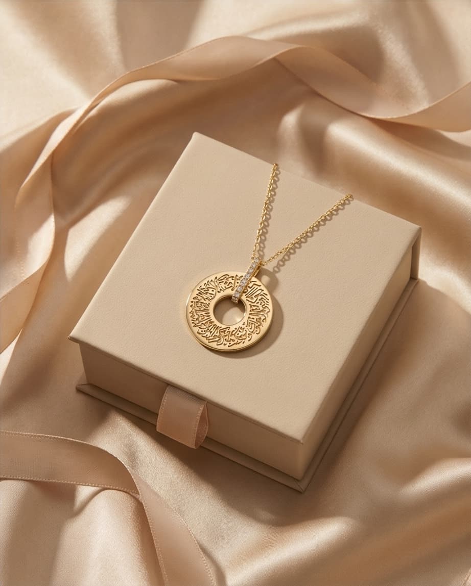 “Ayat”, Arapçada ayet anlamına gelir; Arabesque Serisi’nin geleneksel hat sanatı geleneğiyle buluşunca ortaya çıkan Arabesque Ayat hat yazılı altın kolye, hem estetik hem de spiritüel açıdan derin bir anlam taşır. Yüzyıllardır İslam sanatının en önemli ifade biçimi olan hat, bu kolyede altının sıcaklığıyla buluşarak hem koruyucu hem de süsleyici bir parçaya dönüşür.