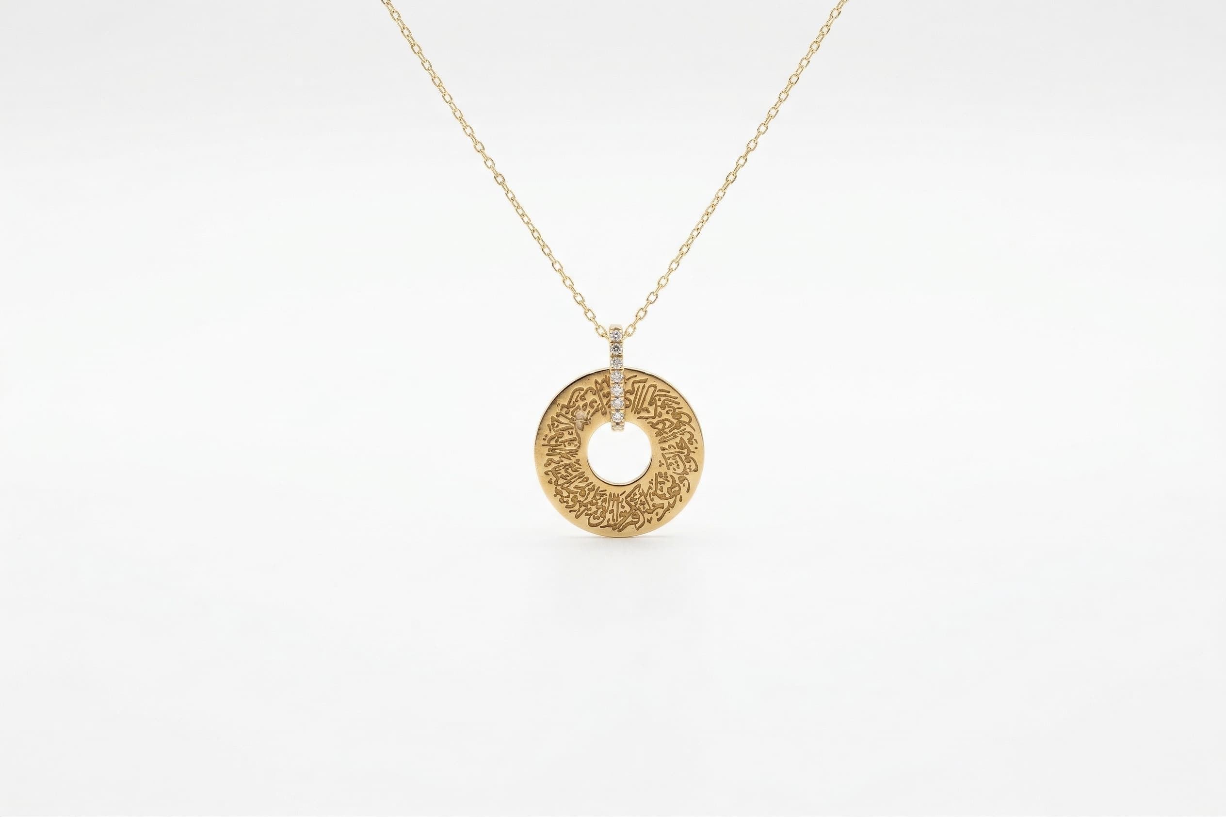 Arabesque Serisi‘nden bu 14 ayar hat yazılı altın kolye, altın daire plakanın tüm yüzeyine işlenmiş Arapça hat yazısıyla manevi derinliği ve sanatsal zarafeti tek bir tasarımda buluşturur. Ortasındaki boşluk sonsuzluğu simgelerken taşlı bağlantı detayı bu anlamlı parçaya ışıltılı bir dokunuş katar.