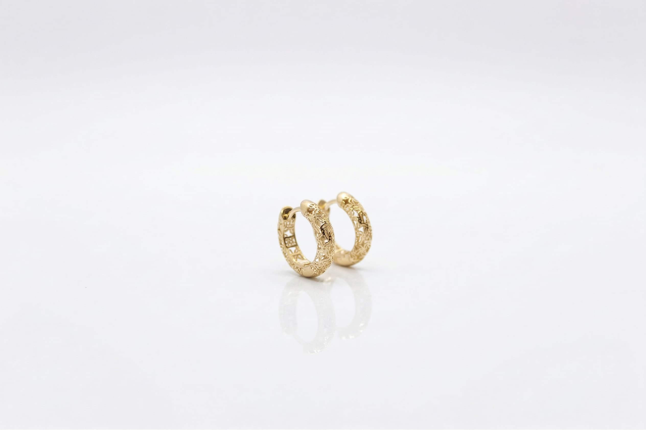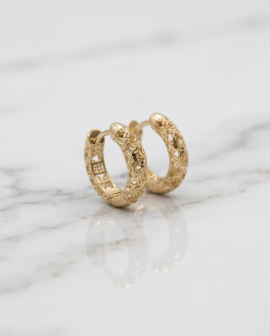 Arabesque Serisi‘nden bu 14 ayar oymalı altın küpe, halka formunun tüm yüzeyine işlenmiş geleneksel arabesque motifiyle Osmanlı ve İslam sanatının en özgün süsleme geleneğini kulağınıza taşır. Kıvrımlı ve birbirine geçen motifler, bu küpeye hem organik hem de geometrik bir derinlik kazandırır.