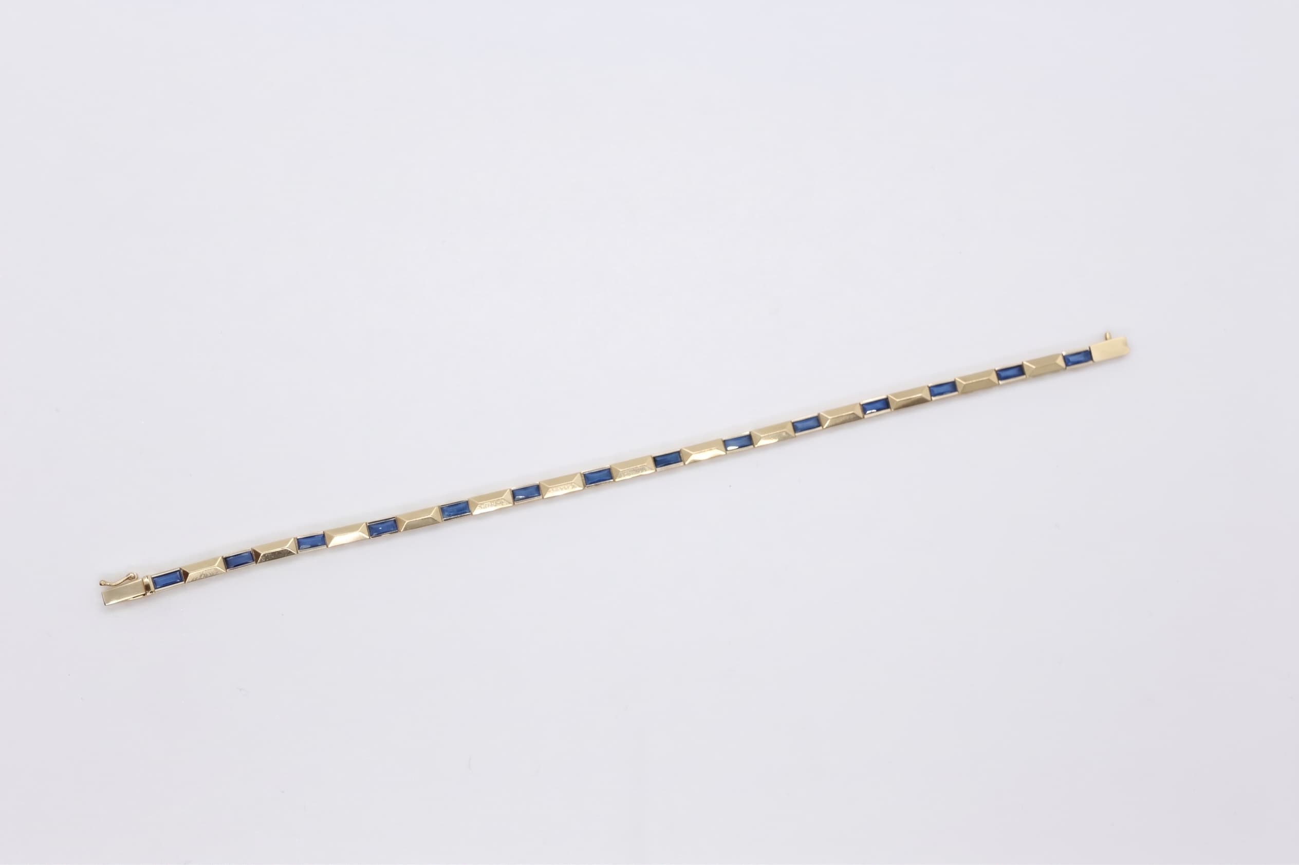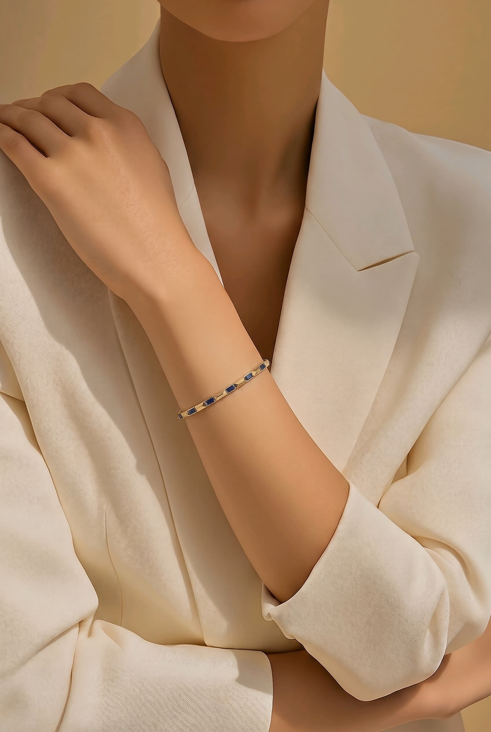 Scarlet Serisi’nin mavi tonlardaki yorumu olan Azure Line mavi taşlı altın tenis bileklik , kare kesim mavi taşların sarı altın halkalar arasında oluşturduğu o soğuk ve asil kontrastı bileğinize taşır. Aynı kusursuz ritim, bu kez derin lacivertin sakinliğiyle kendini gösterir.