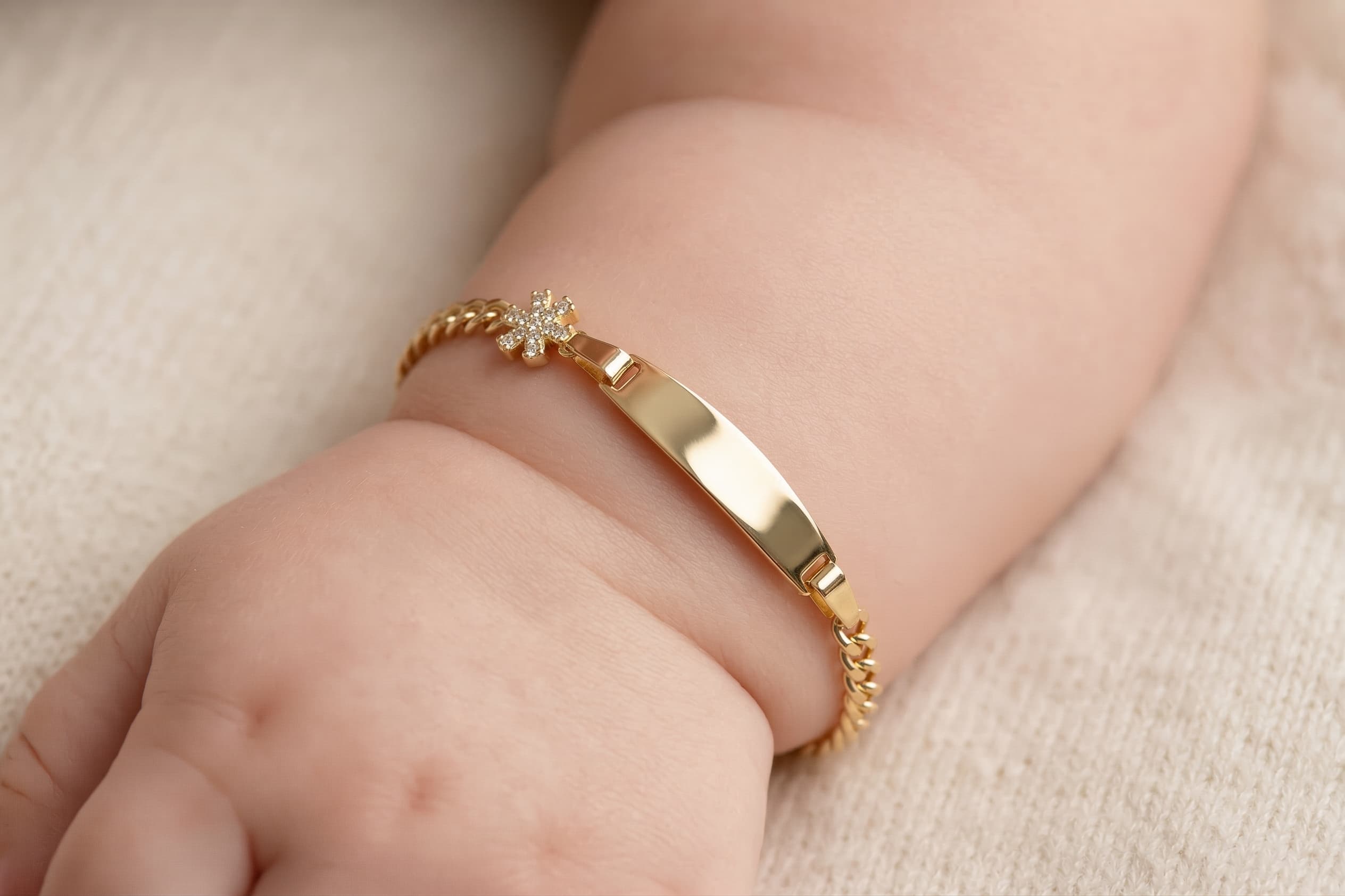 Minik ellerine en güzel dokunuşu hediye edin. Minik Serisi İsimli Bebek Künyesi kar tanesi detayıyla, bebeğinizin bileğini zarif bir kar tanesi charmıyla süslerken isim plakasına işlenecek özel gravürle ona ait eşsiz bir hatıra oluşturur.