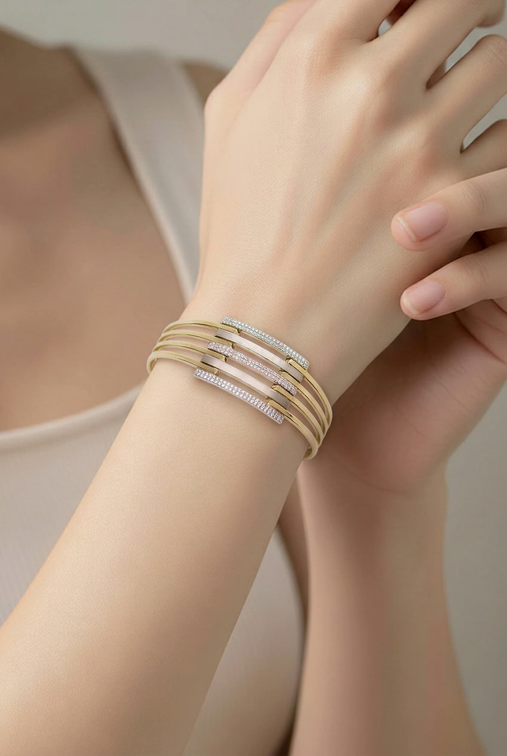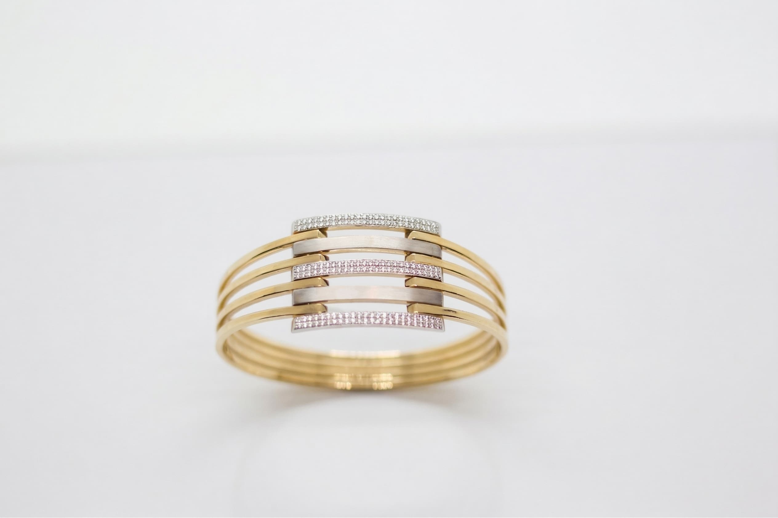 Bloc Serisi‘nden bu 14 ayar çok sıralı altın kelepçe, dört sıra sarı altın rayı boyunca uzanan beyaz altın köprülerin her birinde parlayan pavé zirkon taş dizileriyle mimari bir şıklık sunar. Sarı altının sıcak tonu ile beyaz altının soğuk parıltısının geometrik bir düzende buluşması, bu kelepçeye hem modern hem de sofistike bir karakter kazandırır.
