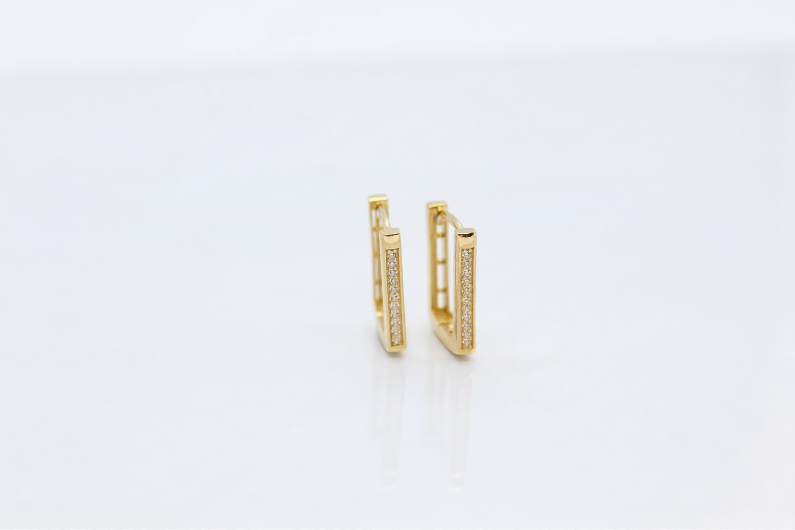 Bloc Serisi‘nden bu 14 ayar taşlı kare altın küpe, keskin köşeli kare formu ve içini dolduran beyaz zirkon taş sırasıyla geometrik takı estetiğinin en saf örneğidir. “Frame” adı tam olarak bunu anlatır: küpe bir çerçeve gibi yüzünüzü çerçeveler, taşlar ise bu çerçeveyi ışıltıyla doldurur.