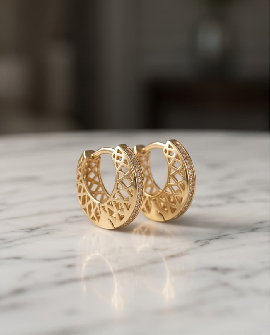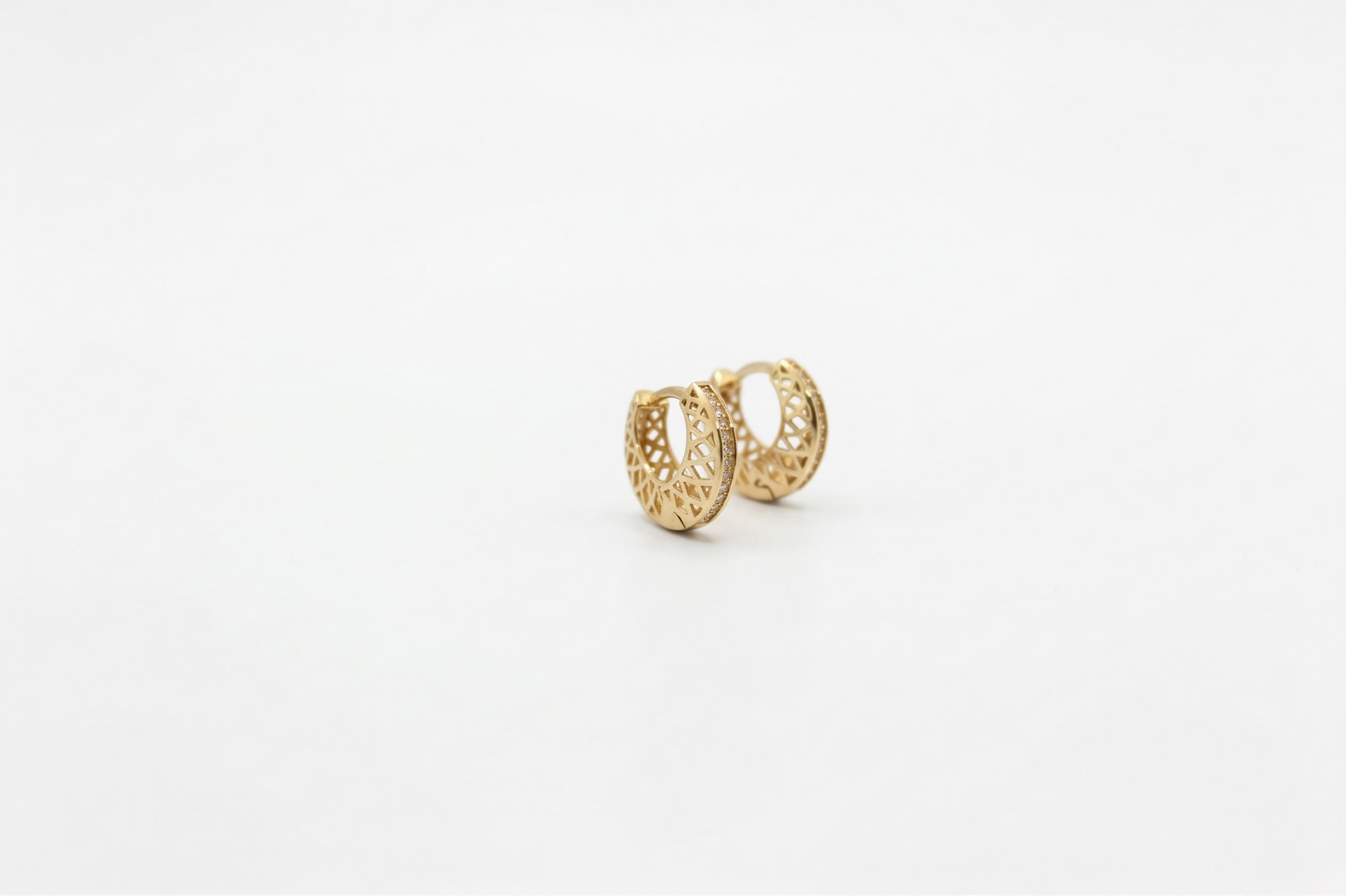 Bloc Serisi‘nden bu 14 ayar kafes desenli altın küpe, halka formunun tüm yüzeyine işlenmiş geometrik kafes oyması ve iç kenarı boyunca uzanan ince zirkon taş sırasıyla mimari zarafeti kulağınıza taşır. Açık kafes yapısının oluşturduğu ışık ve gölge oyunu, bu küpeye hem hacimli hem de hafif bir his kazandırır.