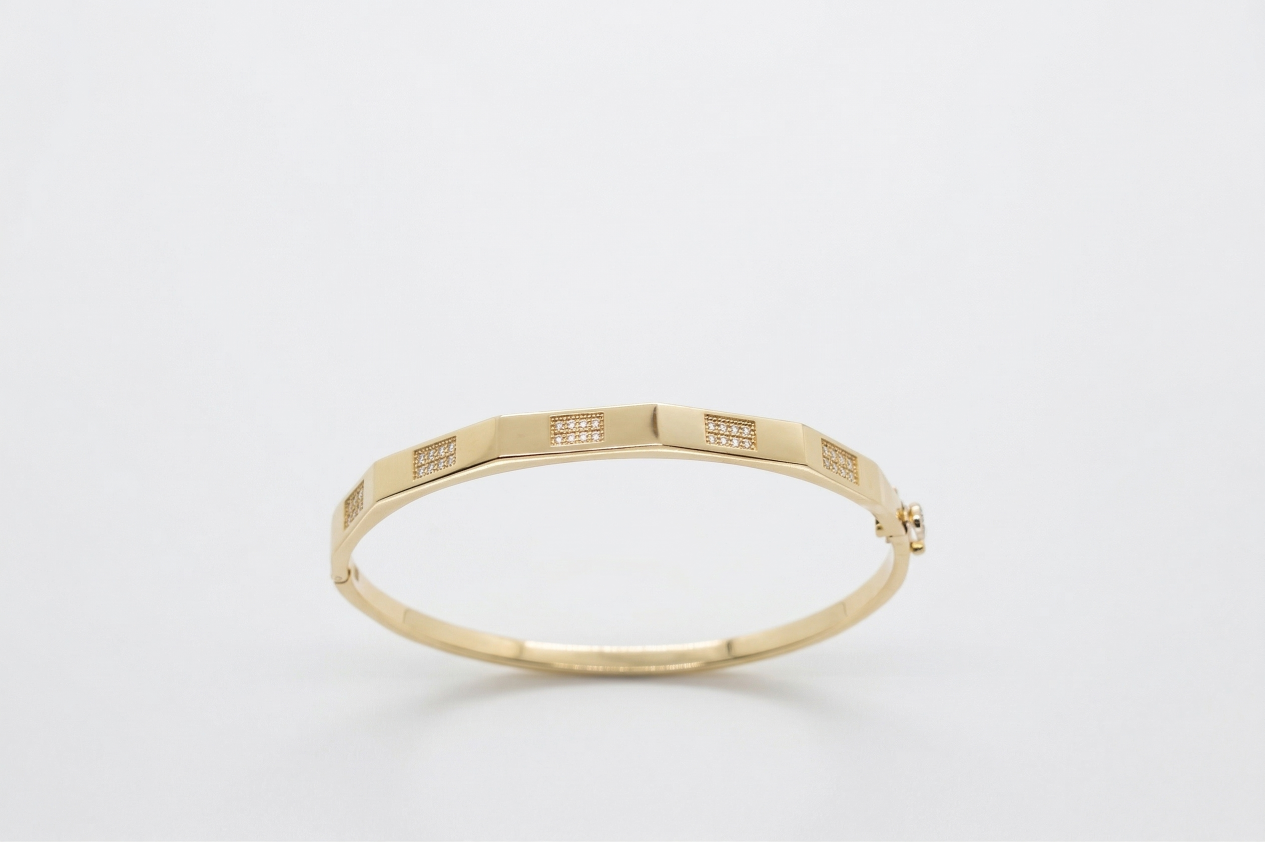 Bloc Serisi‘nden bu 14 ayar segmentli taşlı altın kelepçe, çok yüzeyli fasete gövdesi üzerinde aralıklı yerleştirilmiş pavé zirkon taş bloklarıyla geometrik şıklığı en saf haliyle sunar. Her taş bloğu arasında kalan parlak altın yüzeyler, ışığı farklı açılardan yansıtarak bileğinizde dinamik bir parıltı oyunu yaratır.