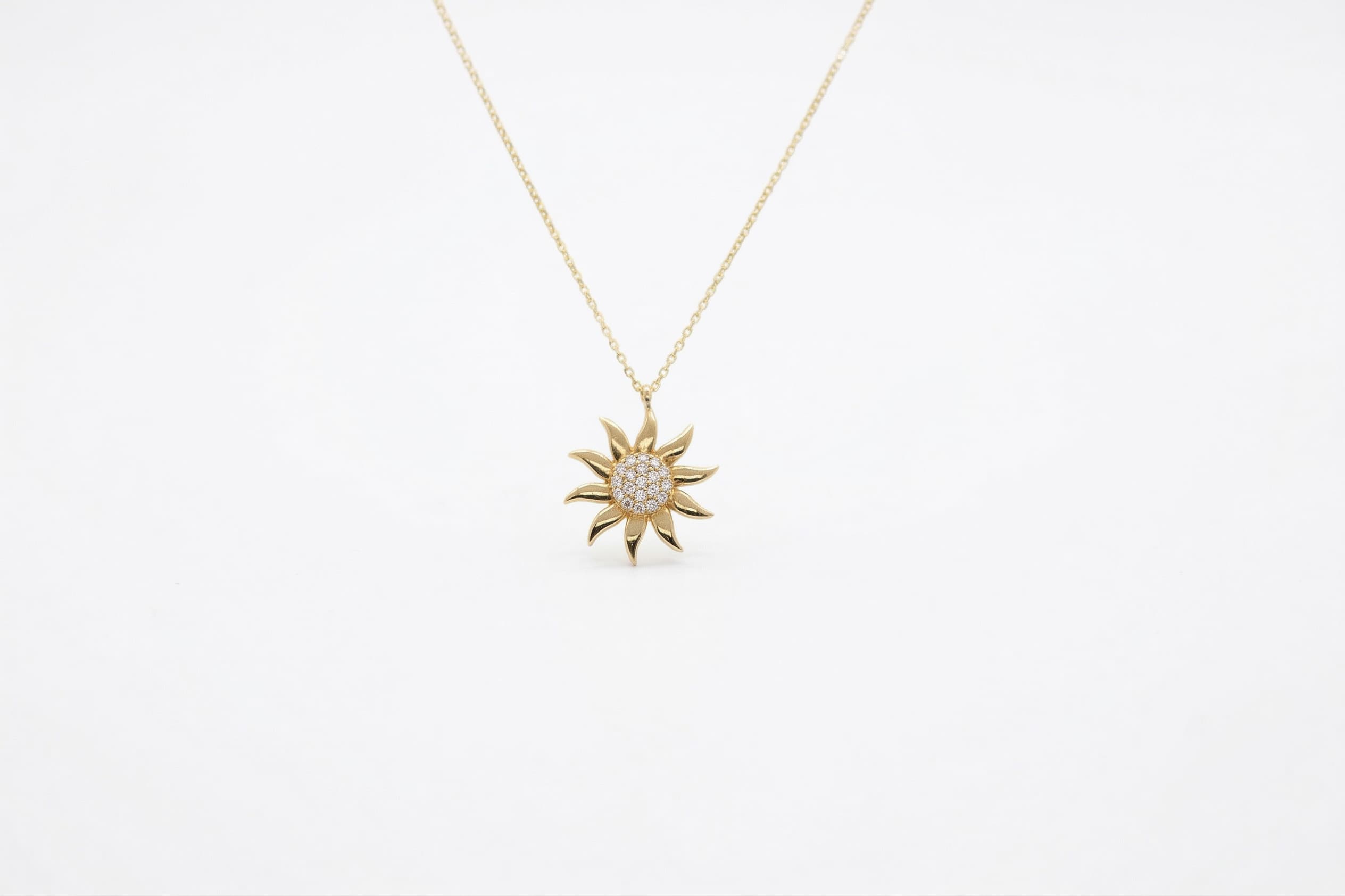 Celeste Serisi‘nden bu 14 ayar güneş figürlü altın kolye, pavé zirkon taşlarla kaplı yuvarlak merkezi ve çevresinden yayılan sivri altın ışın kollarıyla gökyüzünün en parlak yıldızını boynunuza taşır. Her ışın, güneşin o sonsuz enerjisini ve sıcaklığını simgelerken merkezdeki taşlar bu ışığı adeta kristalize eder.