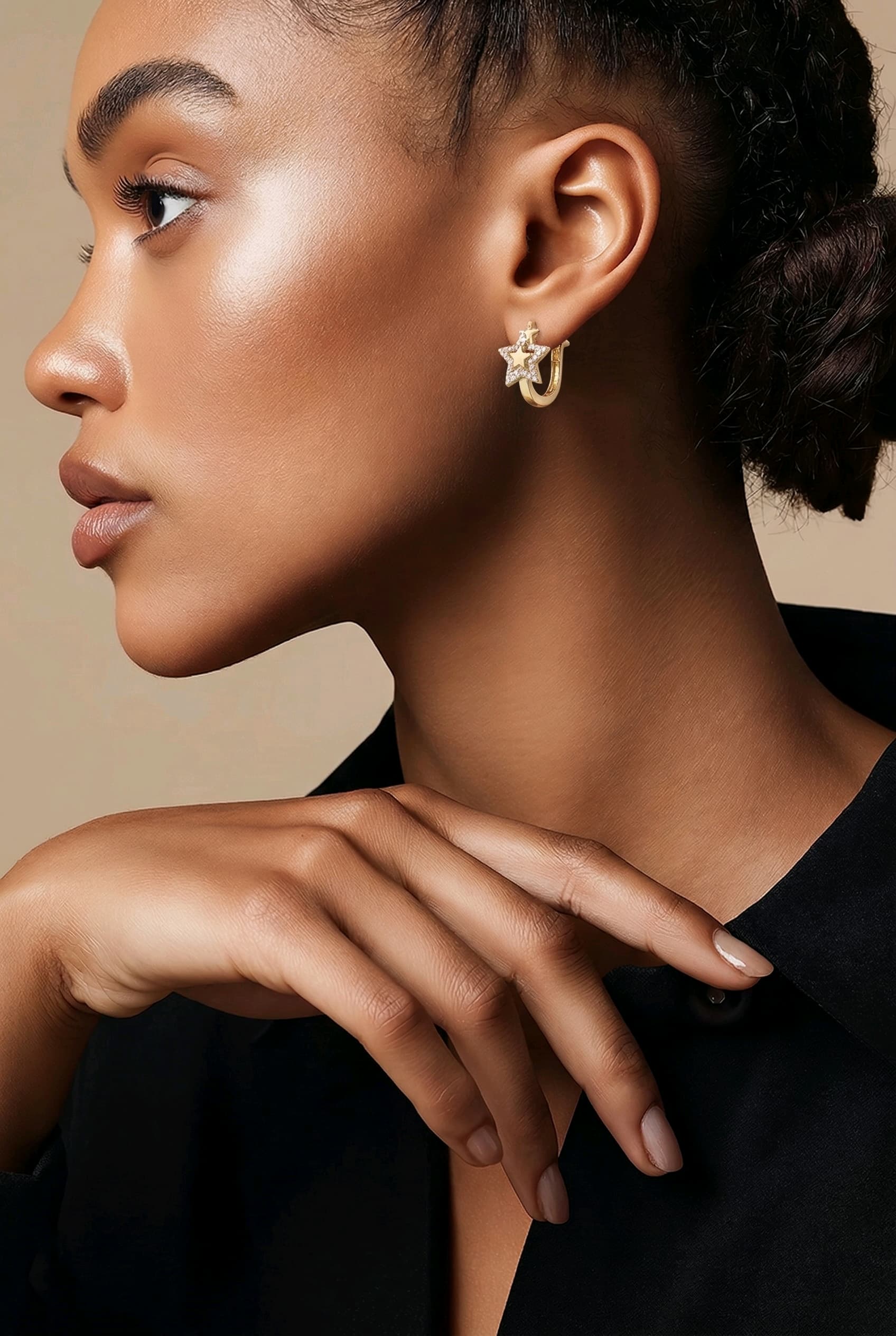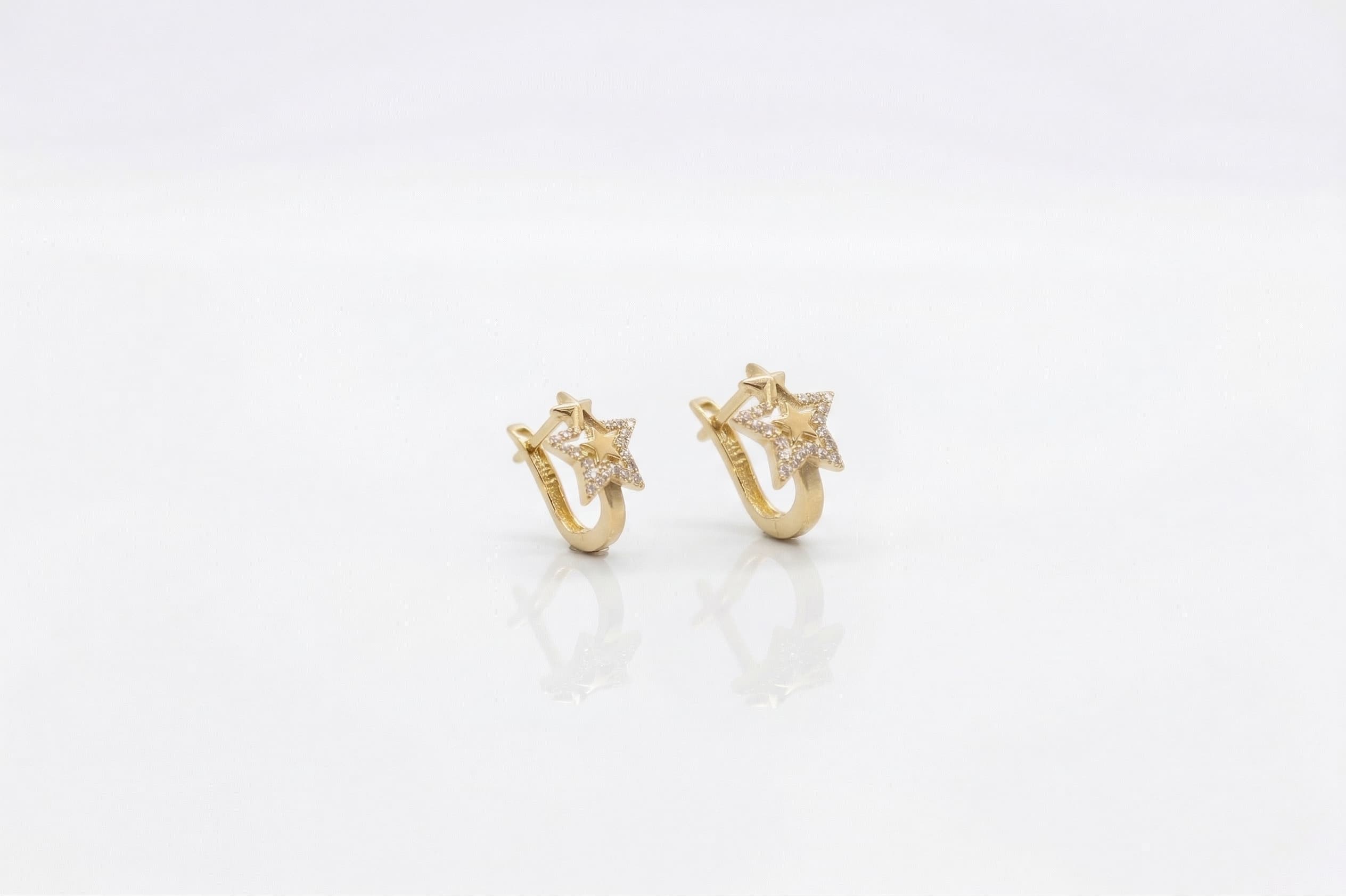 2,35 gram ağırlığındaki hafif yapısı, yıldız motifli altın küpenin gösterişli görünümüne karşın gün boyu konforlu bir kullanım sunar. Sade altın halka gövdesi üzerinde parlayan taşlı yıldız, her kombinle uyum sağlayan ama her zaman dikkat çeken bir odak noktası oluşturur. Gece gökyüzünün sonsuzluğunu ve yıldızların ışıltısını kulağınıza taşıyan bu model, hem romantik hem de modern bir his verir.