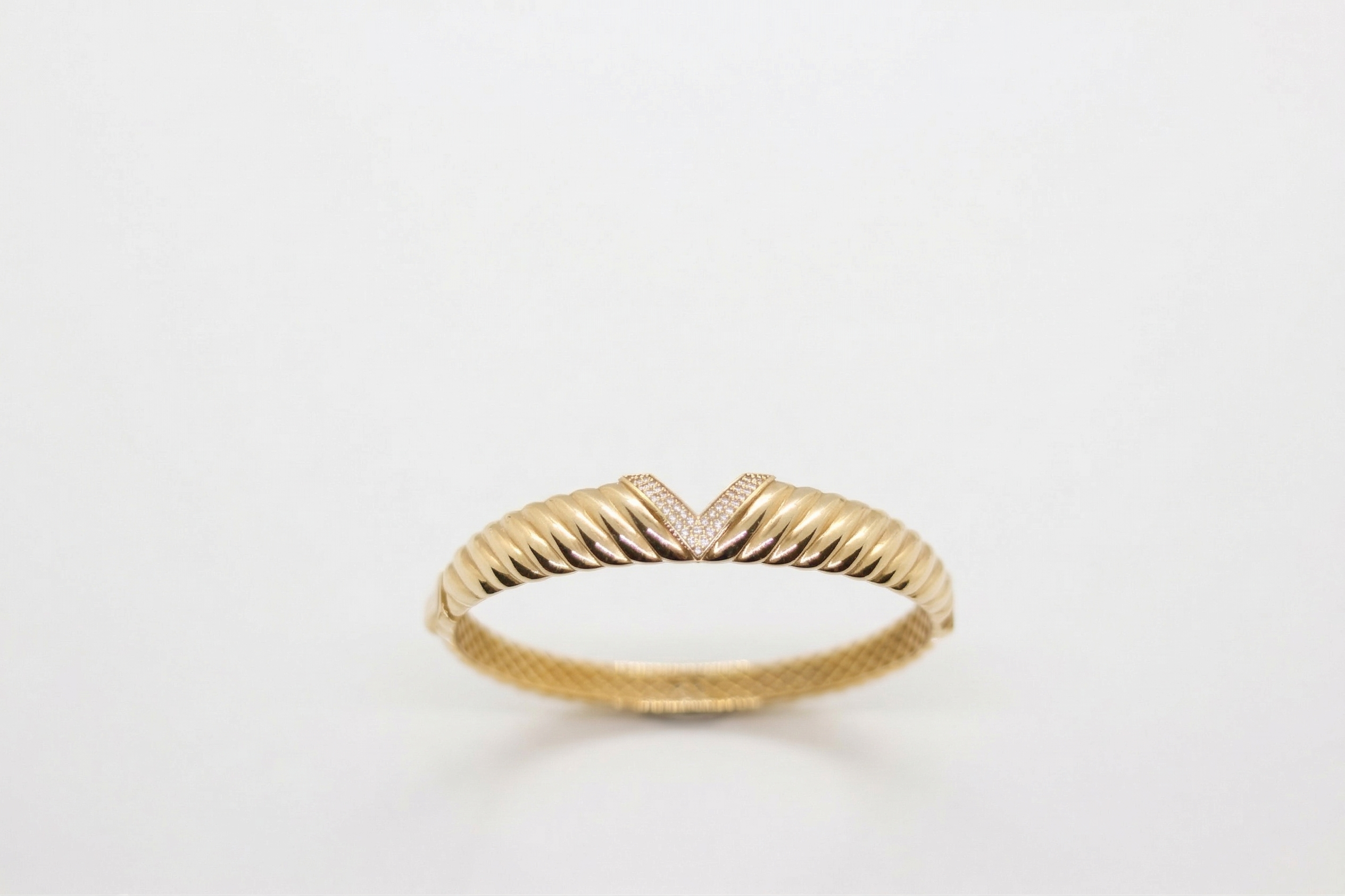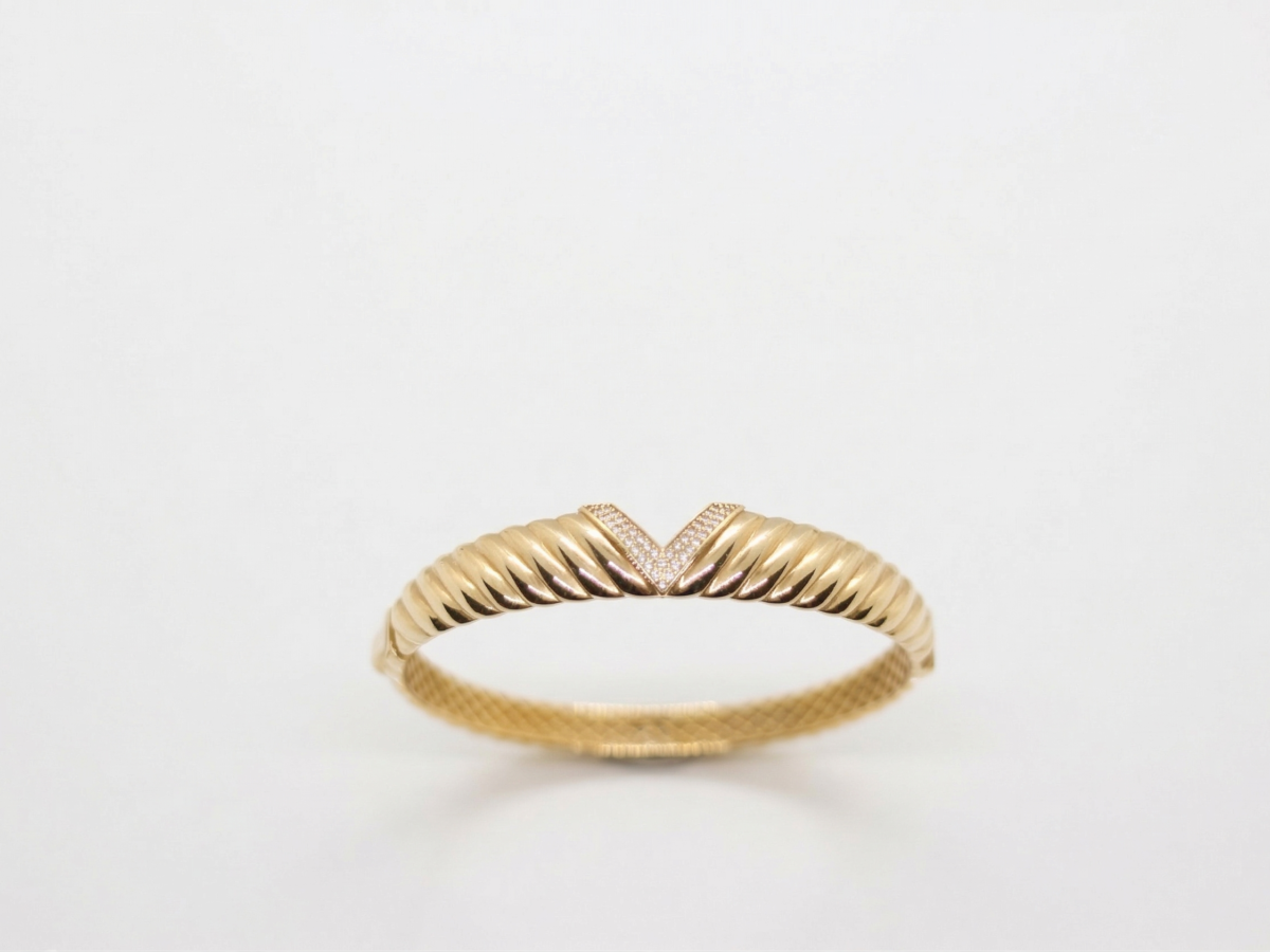 Chevron Serisi‘nden bu 14 ayar kelepçe, tüm yüzeyini kaplayan kabartmalı yiv dokusu ve merkezindeki pavé zirkon taşlı V formuyla güç ile zarafeti tek bir tasarımda buluşturur. “Chevron”, mimaride ve modada V formunu tanımlar; bu kelepçedeki taşlı şevin iki yana uzanan yivli gövdeyle buluşması tam anlamıyla bir mücevher manifestosudur.