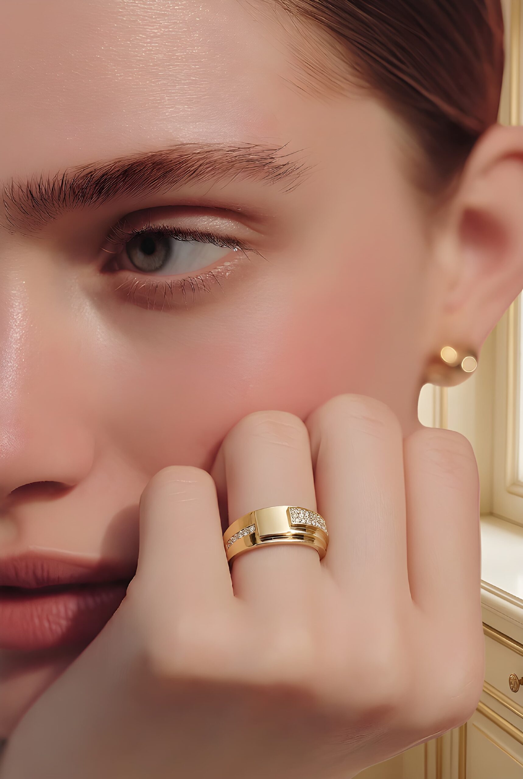 Bu yüzük özellikle doğum günü altın yüzük arayanlar için mükemmeldir. Mimari esinli tasarımı, parmakta zarif bir ışık oyunuyla sofistike bir stil yaratır. Minimal ama etkileyici formu, günlük kombinlerle rahatça uyum sağlar ve özel günlerde stilinizi tamamlayan dikkat çekici bir aksesuardır.