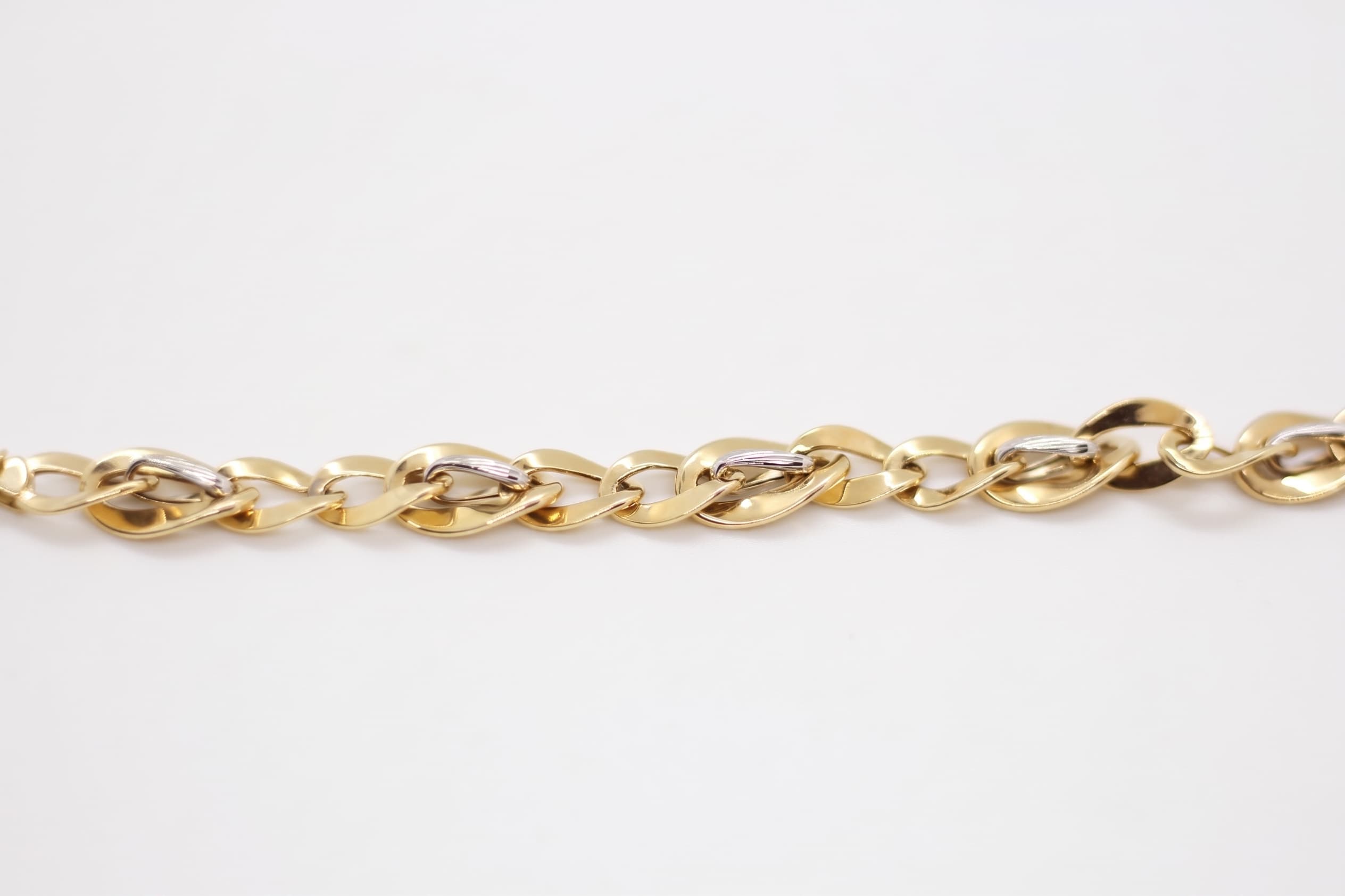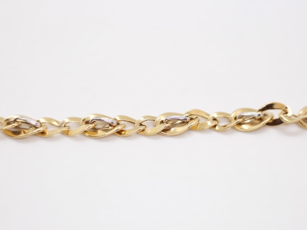 Gurme örgü, kuyumculuğun en dayanıklı ve en çok tercih edilen zincir formlarından biridir. Dual Curb bu klasik yapıyı iki renk altınla yeniden yorumlar: yassı ve birbirine kenetlenen halkalar bileğe düzgün oturur, beyaz altın detaylar ise monotonluğu kırar. Hem altın hem de gümüş tonlu aksesuvarlarla kolayca eşleşen bu gurme altın bileklik, dolabınızdaki en çok yönlü parçalardan biri olacaktır.