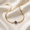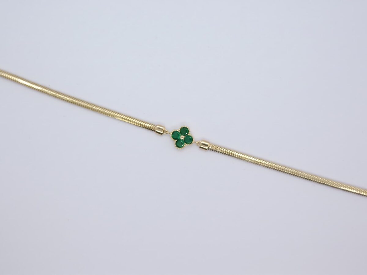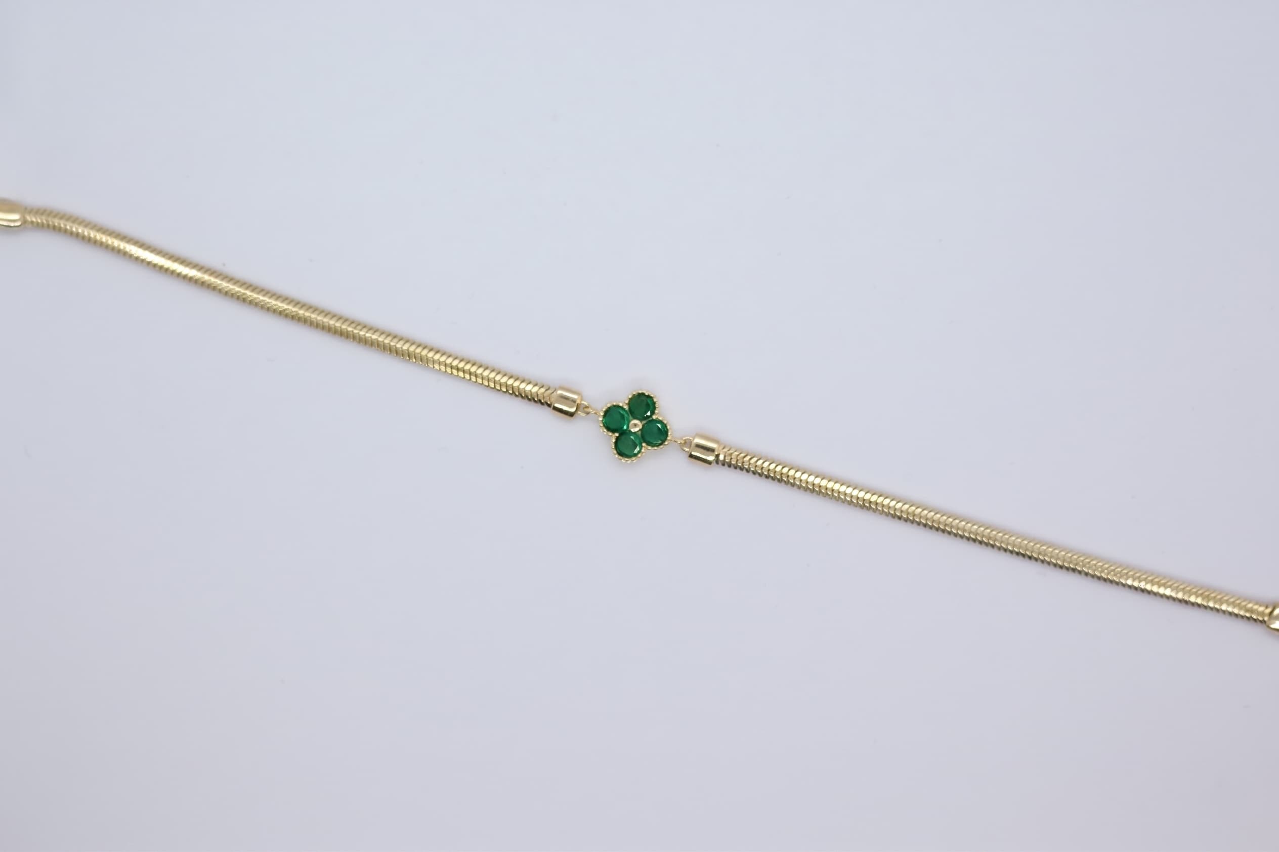Feuille Serisi‘nden bu 14 ayar yeşil taşlı altın bileklik, düz snake zincirin üzerinde parlayan zümrüt yeşili zirkon taşlı dört yapraklı çiçek charmiyle doğanın en canlı ve en taze rengini bileğinize taşır. Yeşilin derin tonu ile altının sıcak parlaklığı arasındaki bu kontrast, bilekliğe hem doğal hem de sofistike bir karakter kazandırır.