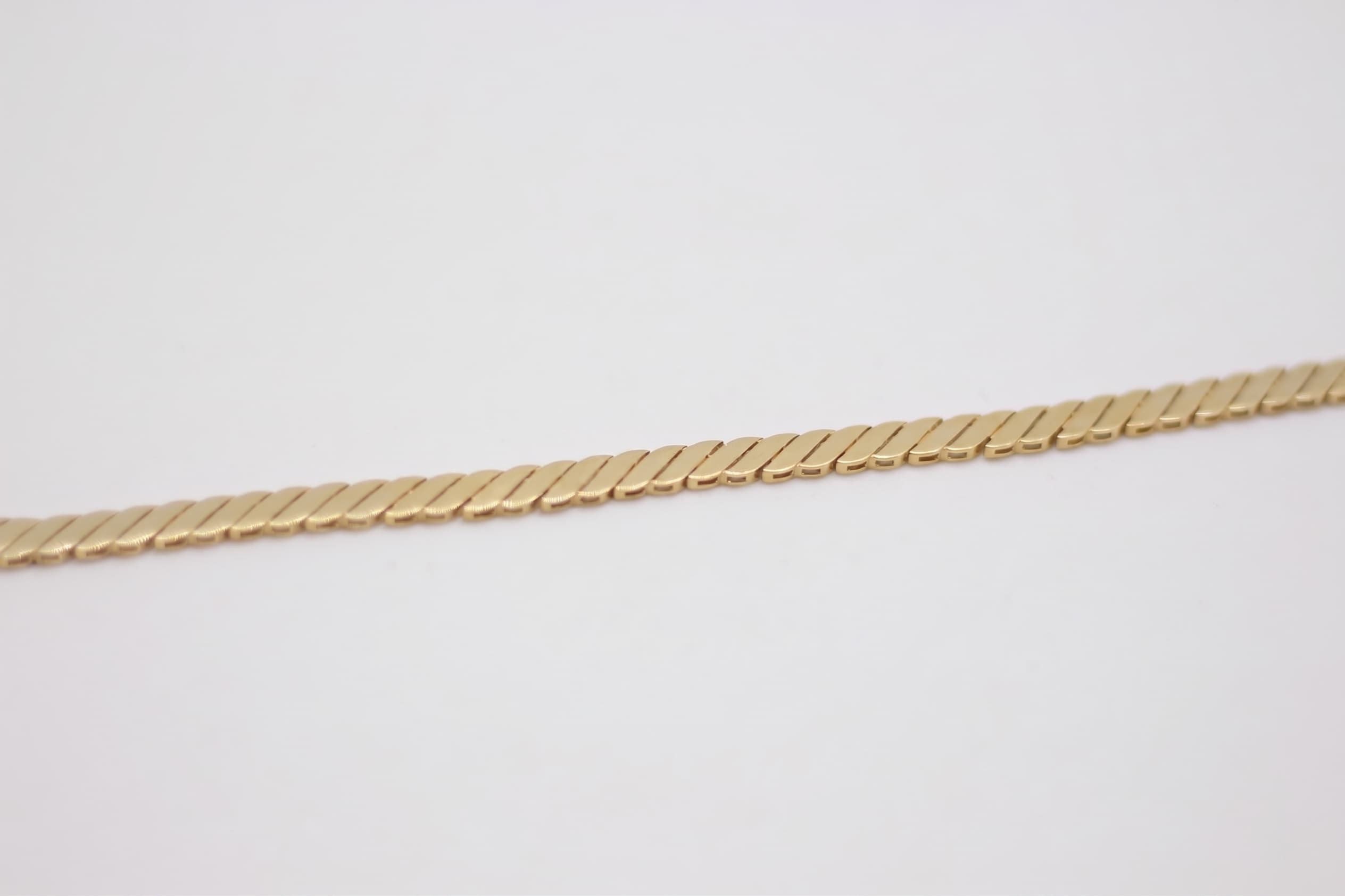 Spina Serisi’nin gücünü bileğe taşıyan italyan örgü altın bileklik Spina Band, yassı dikdörtgen plakaların diagonal açıyla yan yana dizilmesiyle oluşan balıksırtı dokusunu modern bir İtalyan örgü formunda sunar. Her plaka, bir öncekinin üzerine hafifçe binecek şekilde yerleşir ve bu tekrar, bileğe organik ama mimari bir hareket kazandırır.