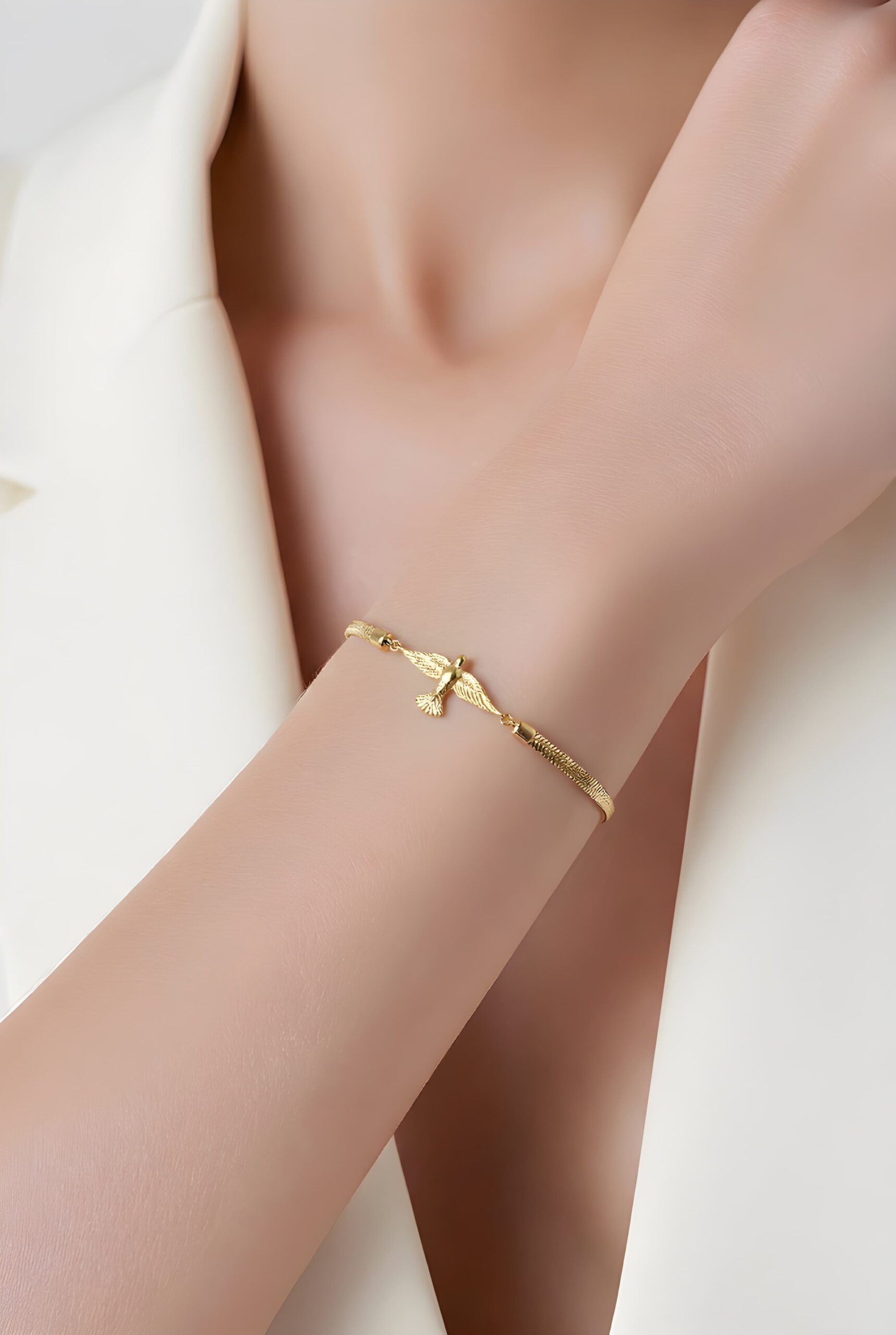 Kanat altın bileklik tasarımı, günlük kombinlere feminen ve ışıltılı bir dokunuş katarken özel günlerde de sofistike bir tamamlayıcı olarak öne çıkar. İnce ve zarif yapısı sayesinde tek başına kullanılabilir ya da diğer altın bilekliklerle birlikte kombinlenebilir.