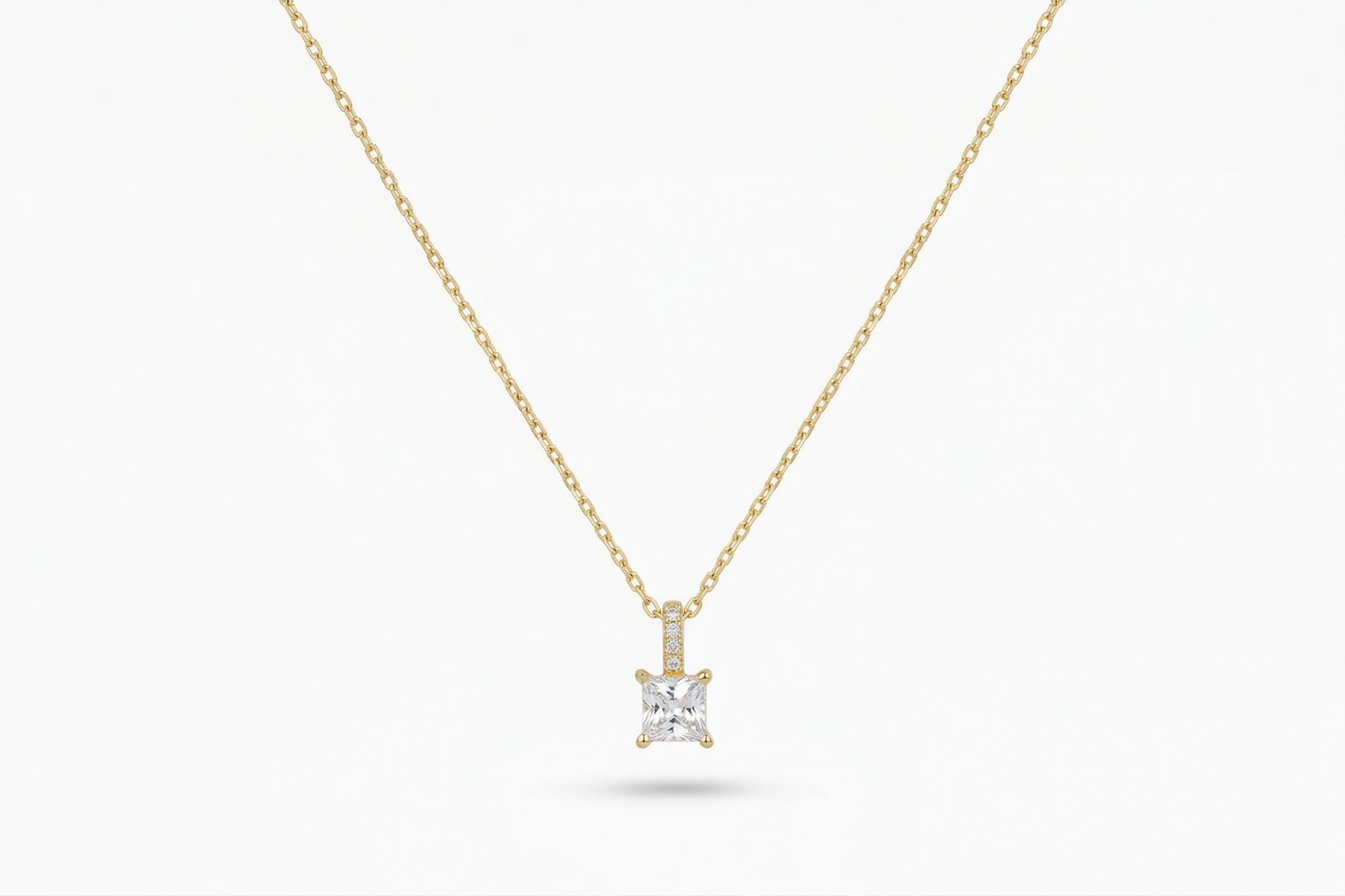 Lumière Serisi‘nden bu 14 ayar tek taşlı altın kolye, princess kesimli kare zirkon taşın saf parlaklığını en sade ve en güçlü haliyle sunar. Üst kısmındaki küçük pavé taş detayı, ana taşa zarif bir geçiş sağlarken ışığın tüm açılardan yansımasına zemin hazırlar.