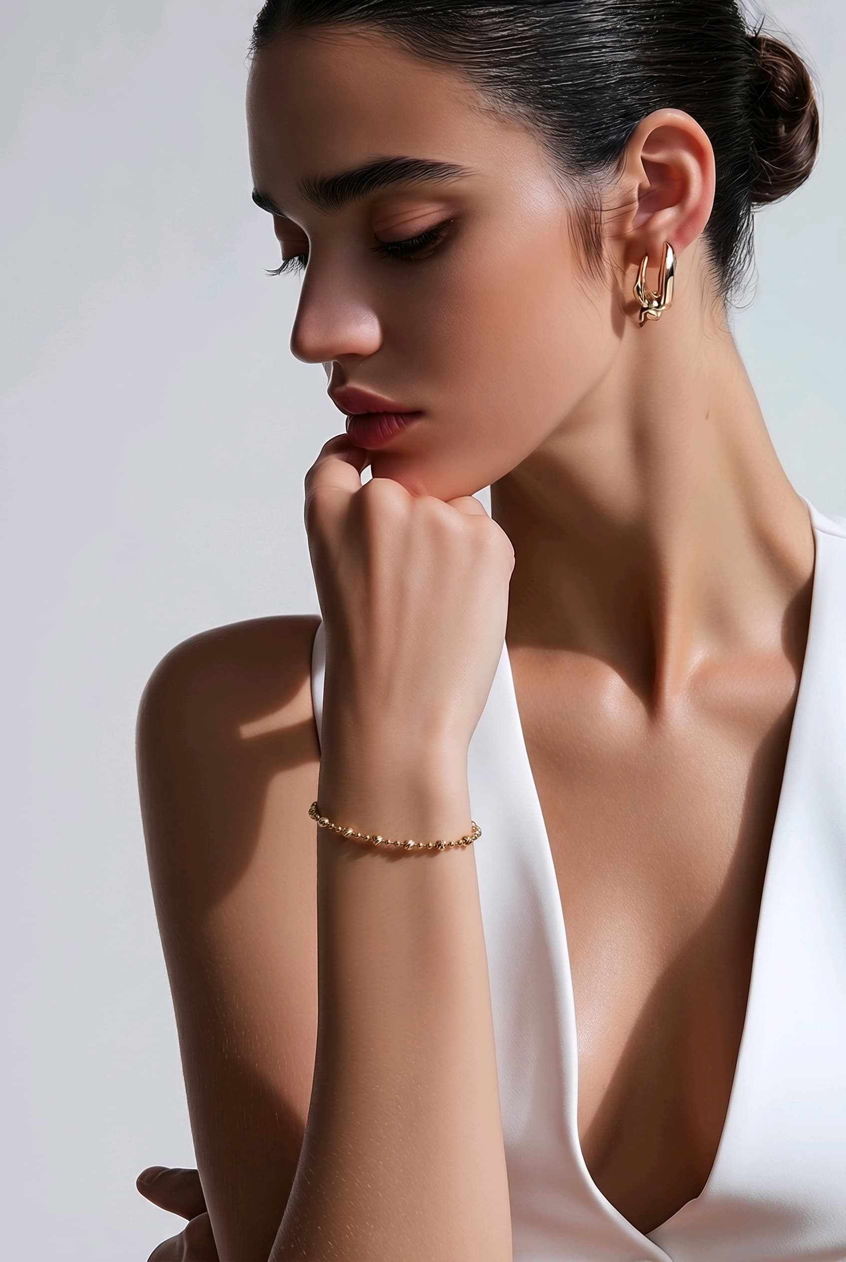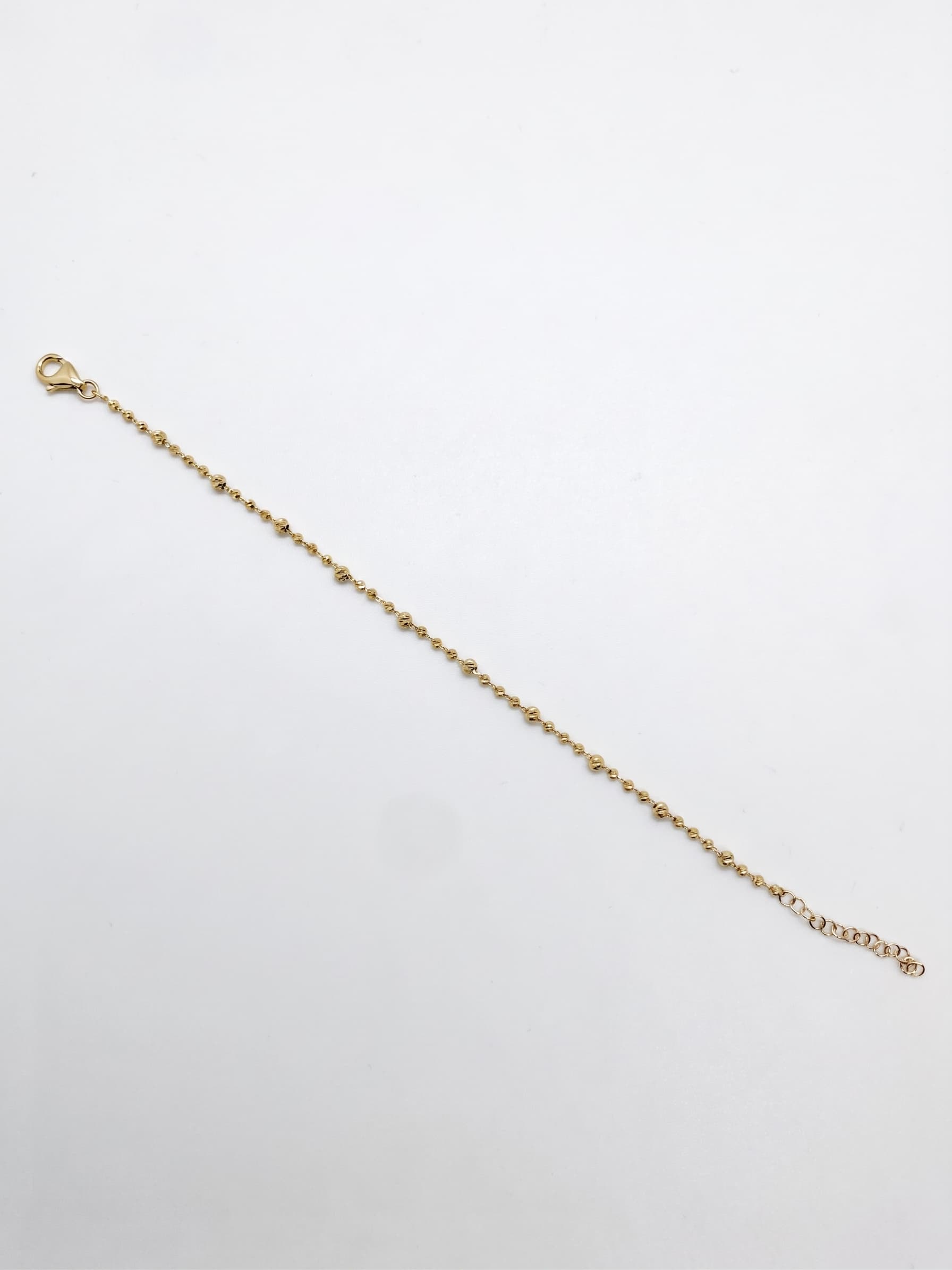 Lumière Serisi‘nden bu 14 ayar boncuklu altın bileklik, ince zincir üzerinde düzenli aralıklarla dizilen çentikli altın boncuklarıyla sadeliği ve ışıltıyı mükemmel bir dengede buluşturur. Her boncuk, çentikli yüzeyi sayesinde ışığı farklı açılardan yansıtarak bu minimal bilekliğe adeta canlı ve titreşen bir parlaklık katar.