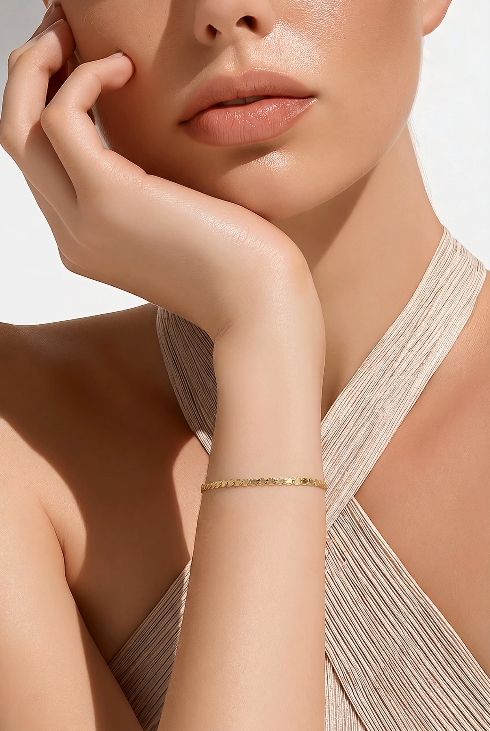 Lumin Serisi’nin bileğe yansıyan ilk ışığı olan Lumin Disc altın pul bileklik, yan yana dizilmiş küçük yassı altın pulcukların her harekette ışığı farklı bir açıdan yakalamasıyla bileğinize canlı ve kırılgan bir parıltı katar. İnce ama fark edilmeden duramayan bir bilekliktir.