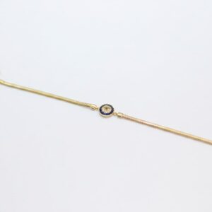 Geleneksel koruyucu sembolleri modern lüksle birleştiren Mashallah Luxe Balıksırtı Nazar Boncuklu Kadın Altın Bileklik, 14 ayar gerçek altından üretilmiştir. Bileği zarifçe saran balıksırtı (herringbone) dokusu, merkezdeki ışıltılı taşlarla bezeli nazar boncuğu figürüyle mükemmel bir uyum sergiler.