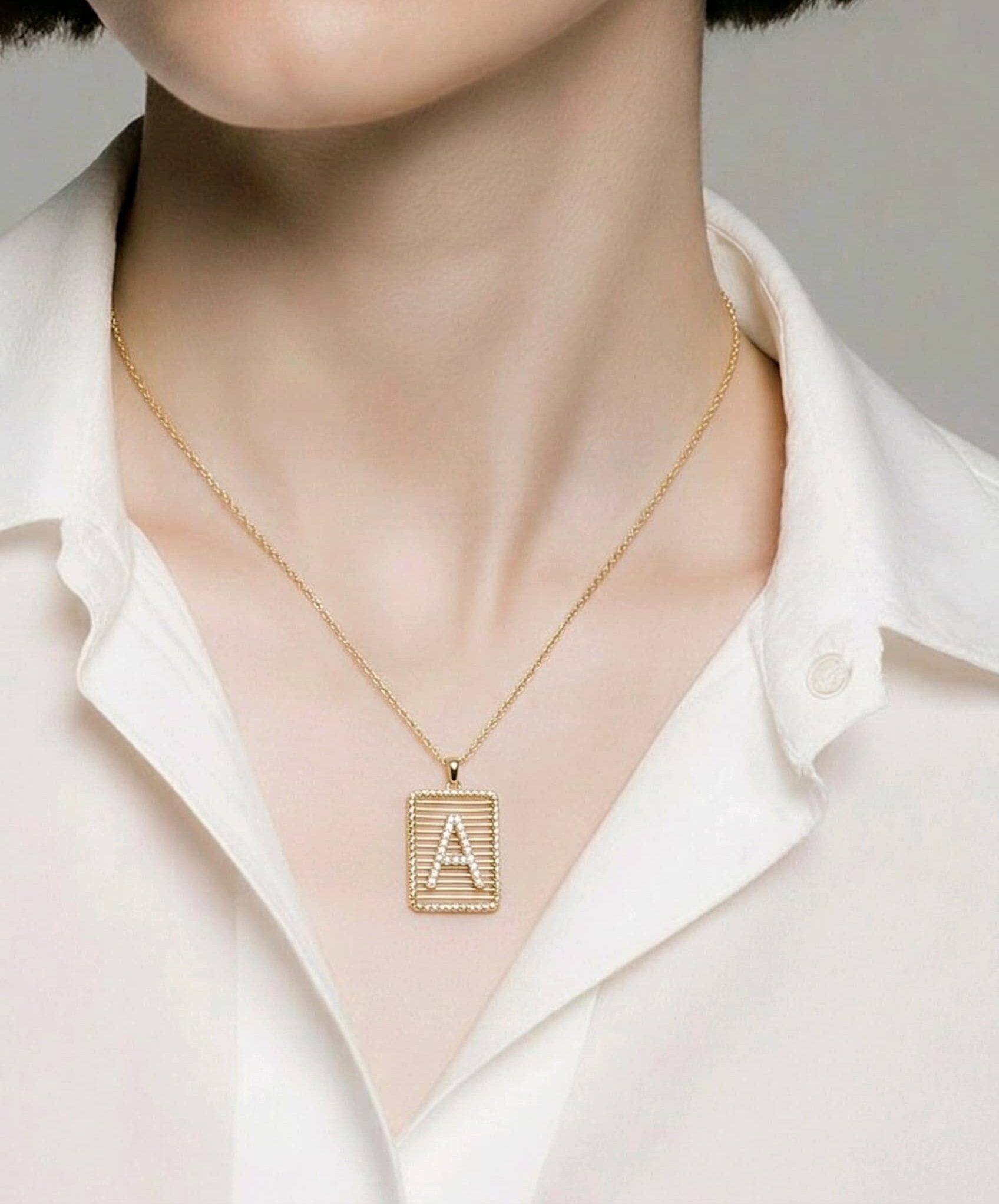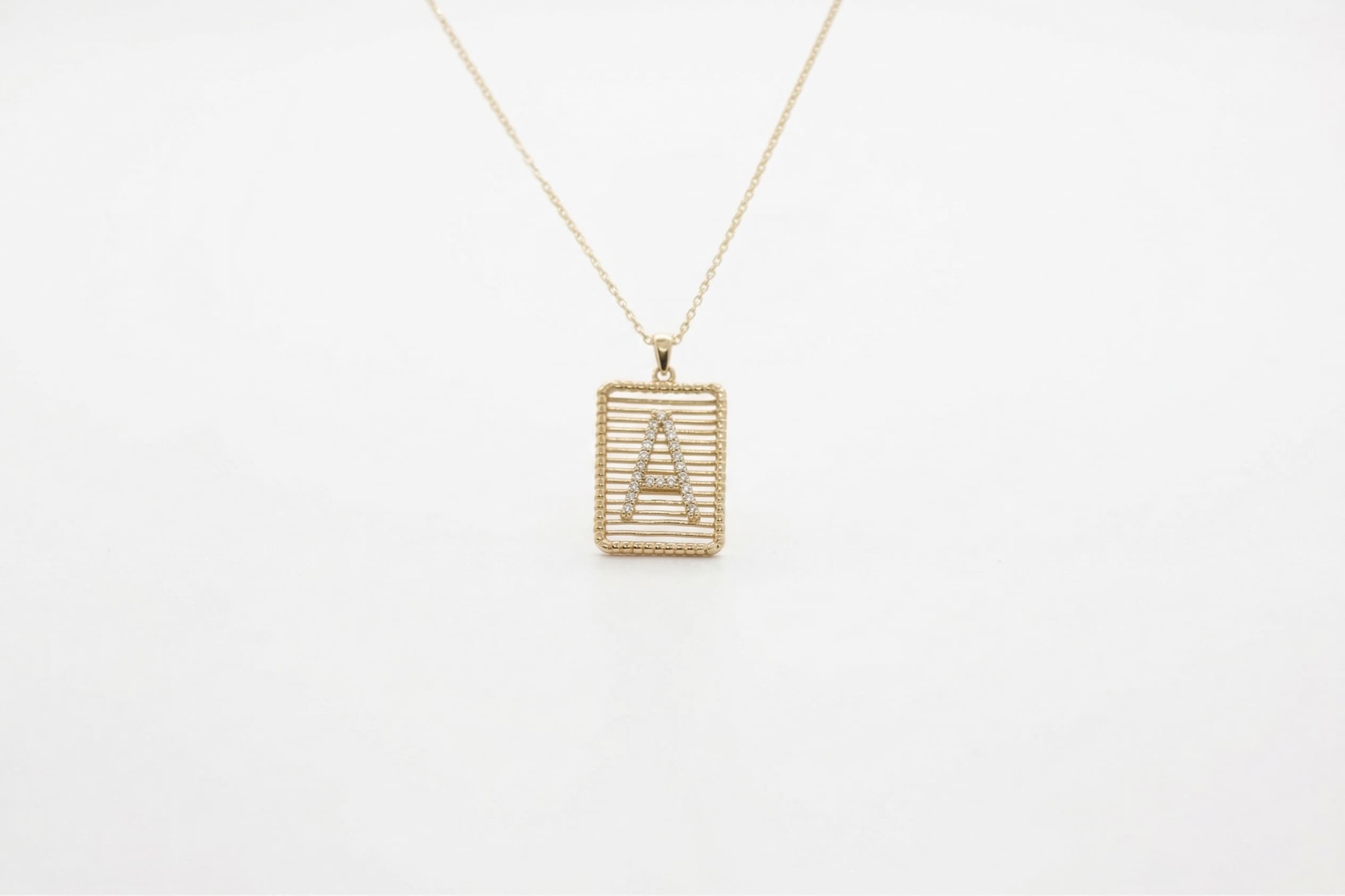 Monogram Koleksiyonu‘ndan bu 14 ayar A harfli altın kolye, dokulu çizgili altın plaka zemininin üzerinde parlayan pavé zirkon taşlı A harfiyle kişiselleştirilmiş takının en zarif halini sunar. Dikdörtgen plaka formunun milgrain kenarlığı ve çizgili arka zemini, bu kolye’ye hem vintage hem de modern bir karakter kazandırır.