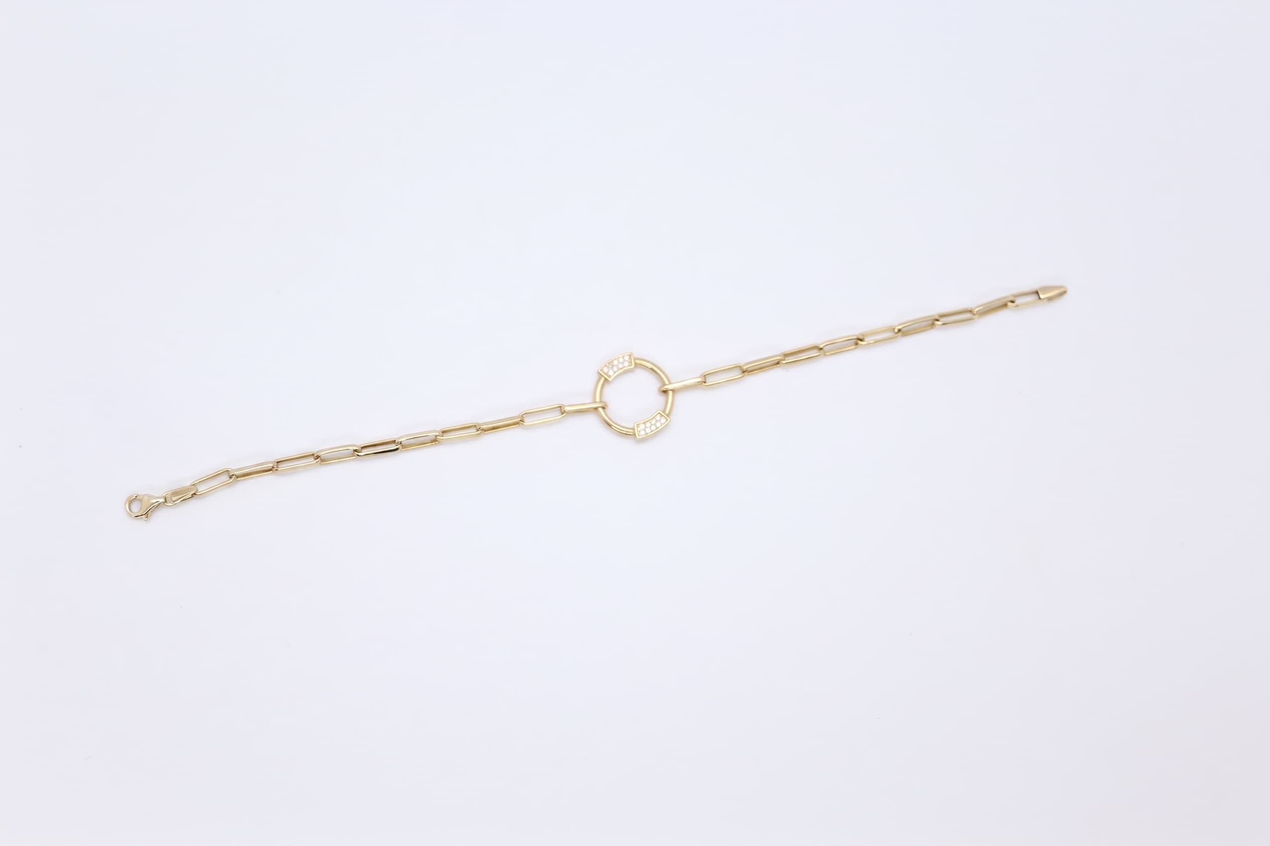 Her halkası kasıtlı olarak büyük tutulmuş olan bu bileklikte boşluk, tasarımın bir parçasıdır. Halkalar arasındaki açıklık ışığın ve tenin görünmesine izin verir; bu da halkalı altın bileklik formuna hafiflik ve şıklık katar. Ortadaki zirkon taşlı daire motifi ise tüm bu endüstriyel sadeliğe ince bir parıltı ekler. Beyaz gömlek manşetinin altından çıktığında ya da kolsuz bir elbiseyle taşındığında eşit derecede etkileyicidir.