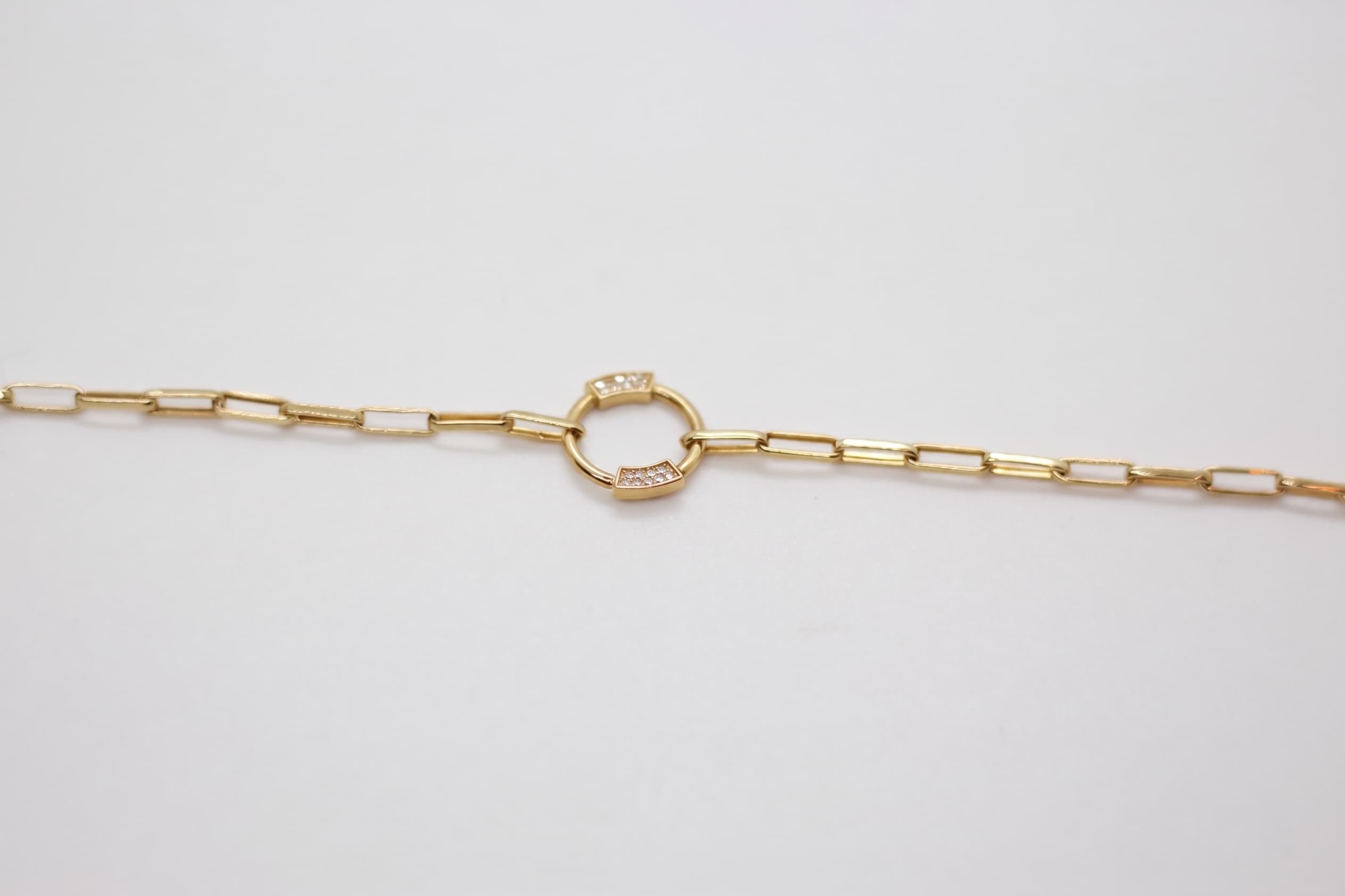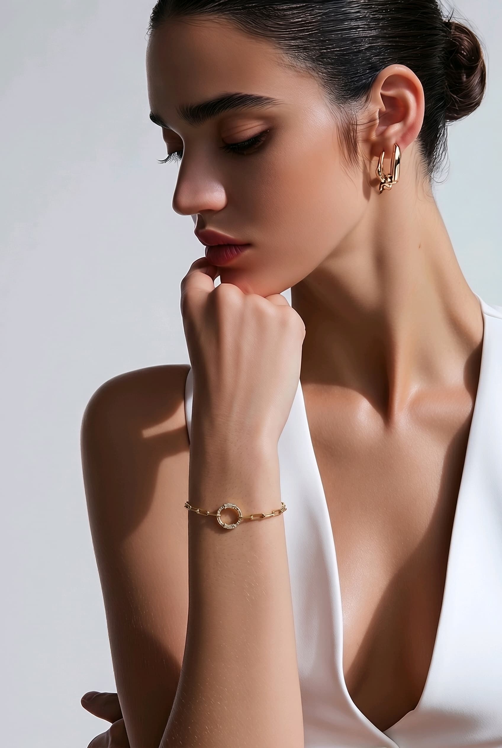 Nexus Serisi’nin imza parçası olan Nexus Lock, paperclip altın bileklik zincirin iki kolunu ortada buluşturan zirkon taşlı yuvarlak kilit motifiyle hem işlevselliği hem estetiği tek bir noktada birleştirir. Kilit yalnızca bir kapanma mekanizması değil, bilekliğin tasarım merkezidir.