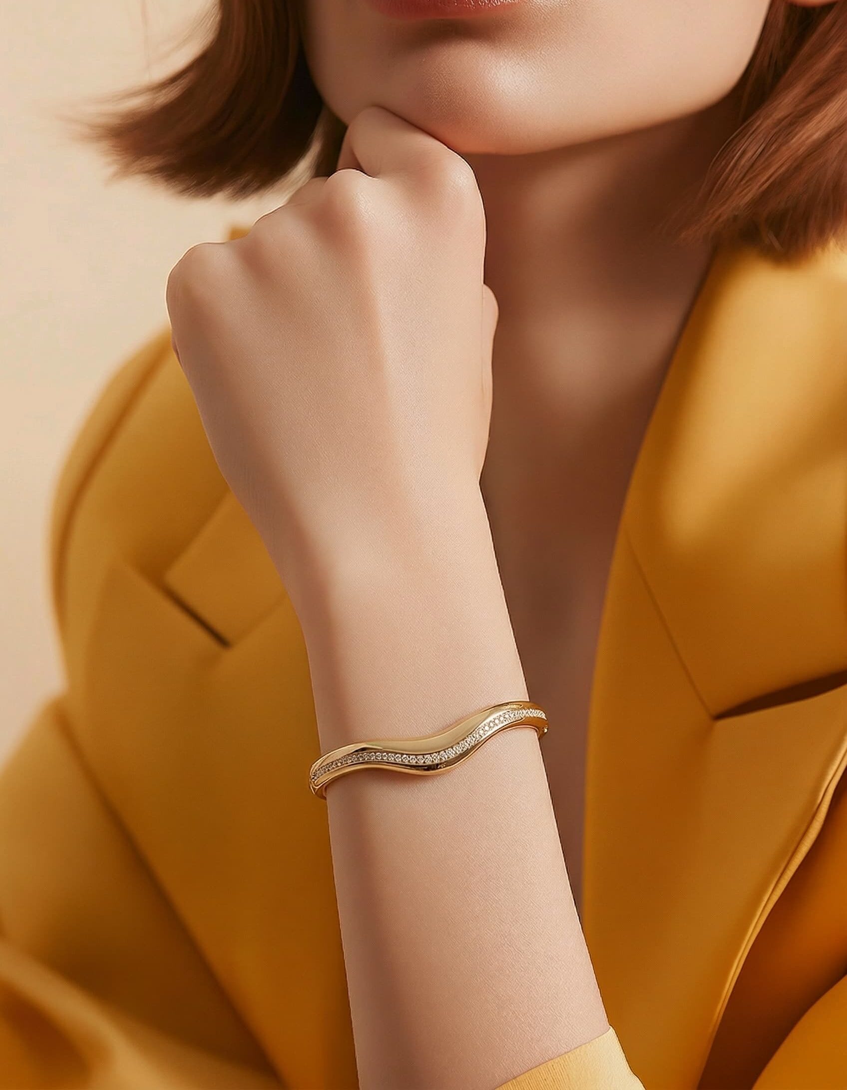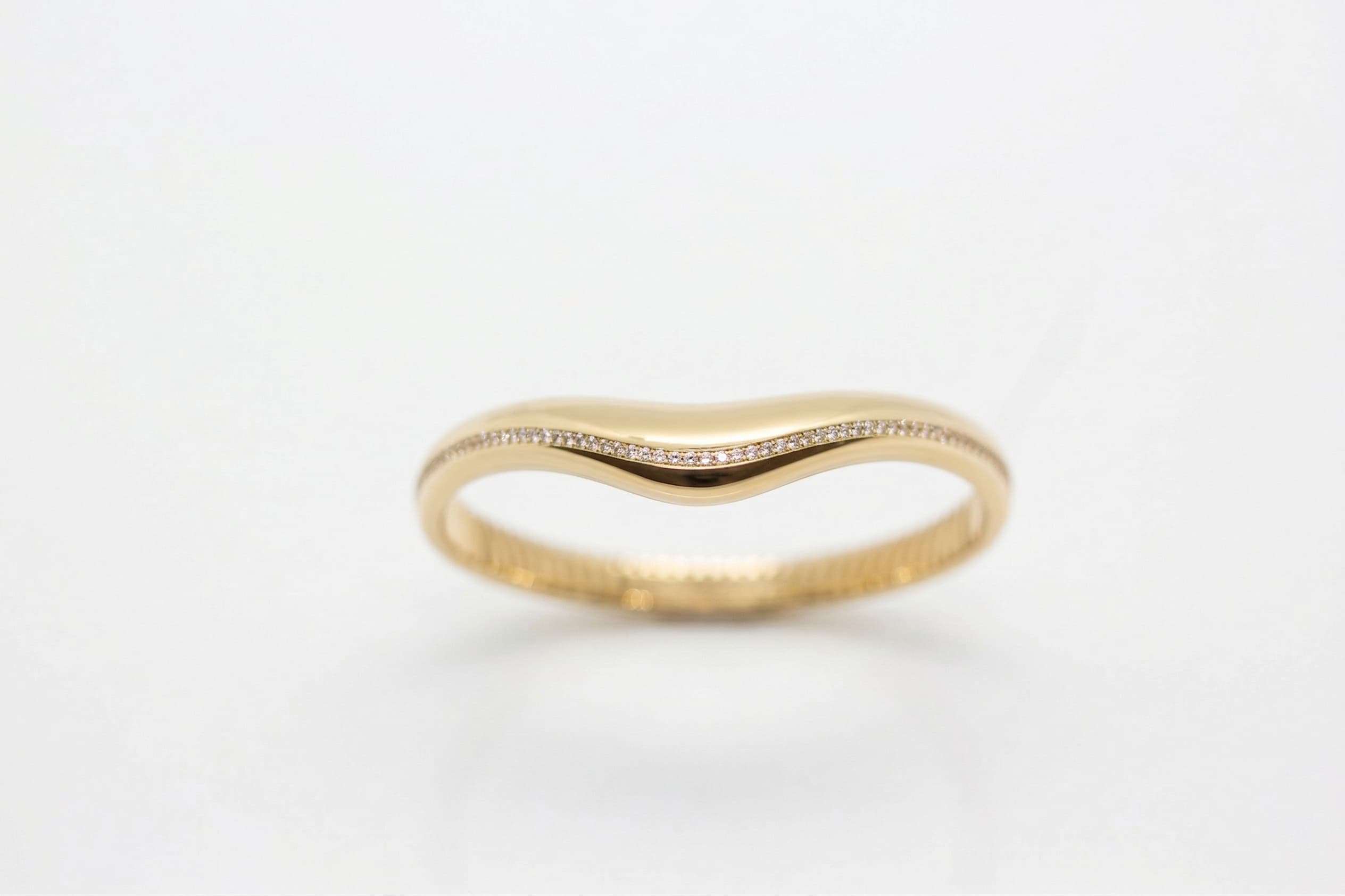 Opus Serisi‘nden bu 14 ayar kavisli taşlı altın kelepçe, geniş ve parlak yüzeyinin tam ortasında çöken zarif V kavsinin kenar boyunca uzanan ince zirkon taş sırasıyla görkemi ve inceliği tek bir formda buluşturur. Masif altın gövdenin güçlü duruşu ile taş sırasının narin çizgisi arasındaki bu karşıtlık, kelepçeye hem sert hem de kadınsı bir karakter kazandırır.