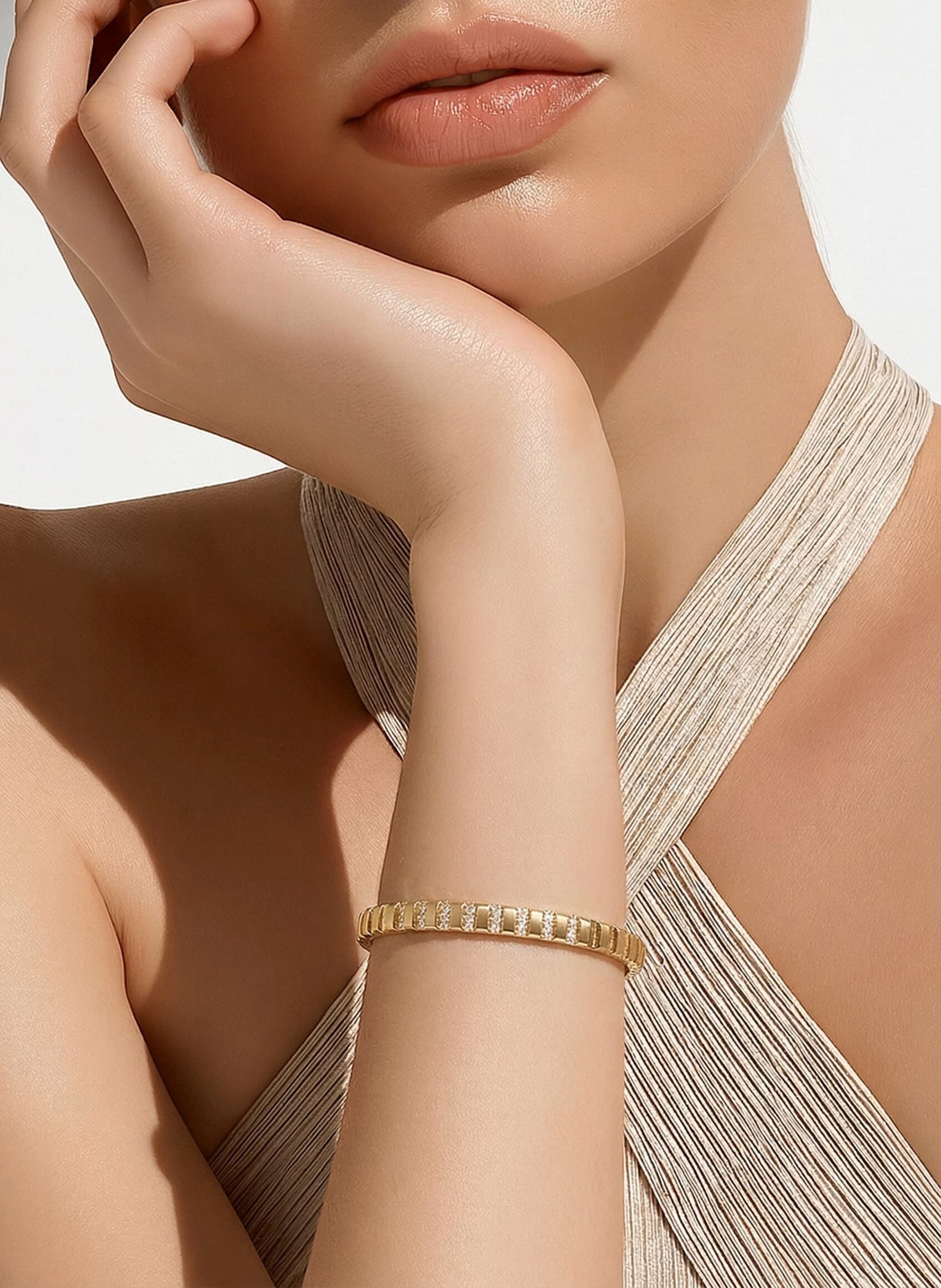 Opus Serisi‘nden bu 14 ayar işlemeli altın kelepçe, boydan boya uzanan kare kabartmalı altın blokların arasına yerleştirilmiş pavé zirkon taş gruplarıyla mükemmel bir ritim ve denge kurar. Her taş grubu bir sonraki altın bloğa zemin hazırlar; bu kesintisiz ritim bileğinizde adeta müzikal bir kompozisyon oluşturur.