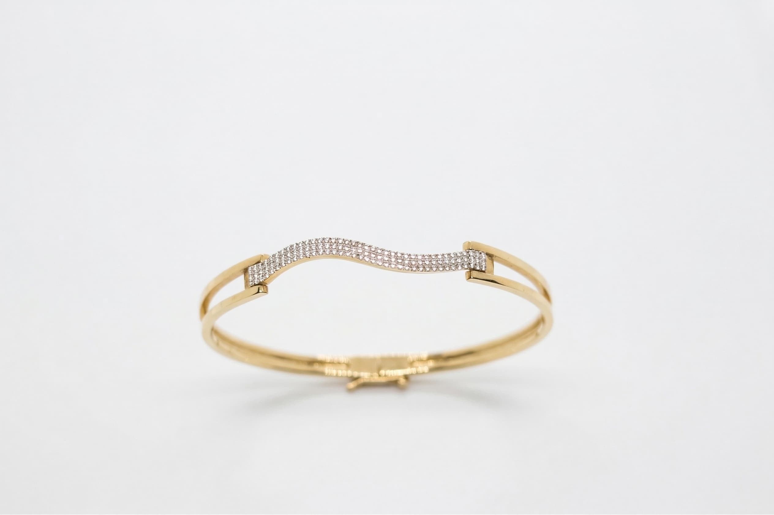 Opus Serisi‘nden bu 14 ayar dalgalı taşlı altın kelepçe, çift ince altın gövdenin tam merkezinde yükselen S formlu pavé zirkon taş şeridiyle suyun akışkanlığını ve zarafetini bileğinize taşır. Taş şeridinin dalgalı formu, durağan bir kelepçeye adeta hareket ve ruh katar.
