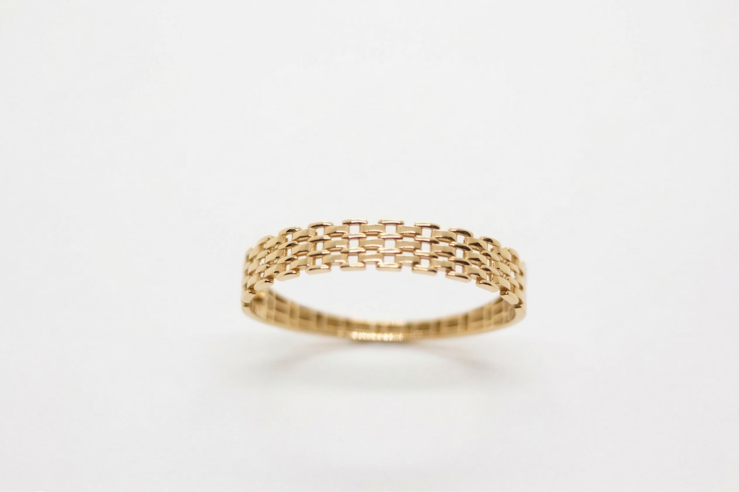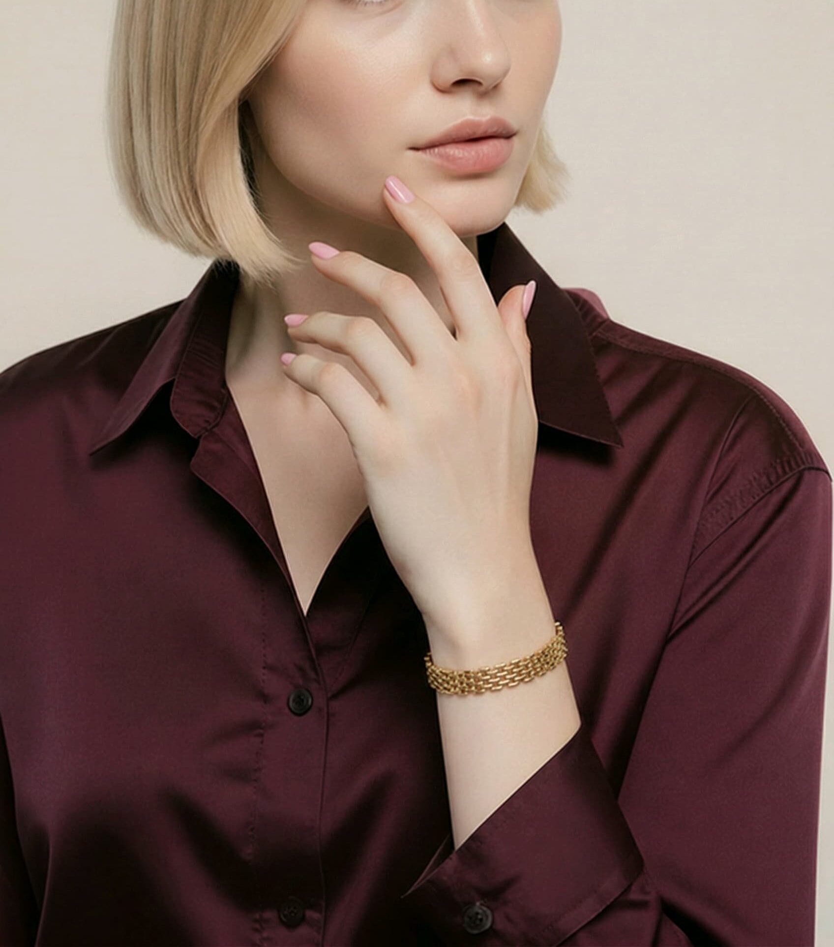 Opus Serisi‘nden bu 14 ayar zincir altın kelepçe, çok sıralı birbirine kenetlenen altın halkalarının oluşturduğu geniş ve güçlü yapısıyla lüks takı dünyasının en ikonik formlarından birini yeniden yorumlar. Her halka bir sonrakiyle kusursuzca bağlanarak bileğinizde hem esnek hem de masif bir his yaratır.