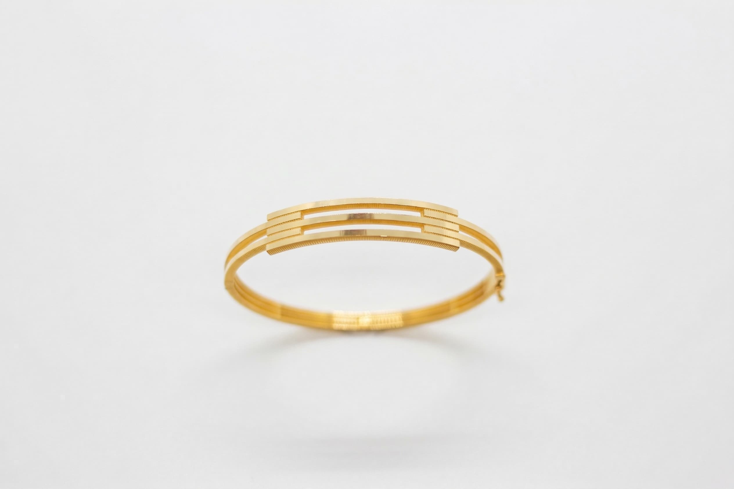 Chevron Serisi‘nden bu 14 ayar paralel çizgili altın kelepçe, üç paralel rayın oluşturduğu simetrik ve yapısal kompozisyonuyla modern mimarinin zarafetini bileğinize taşır. Taşsız sade yapısı, altının doğal parlaklığını ve işlenmiş dokusunu tüm ihtişamıyla ön plana çıkarır.