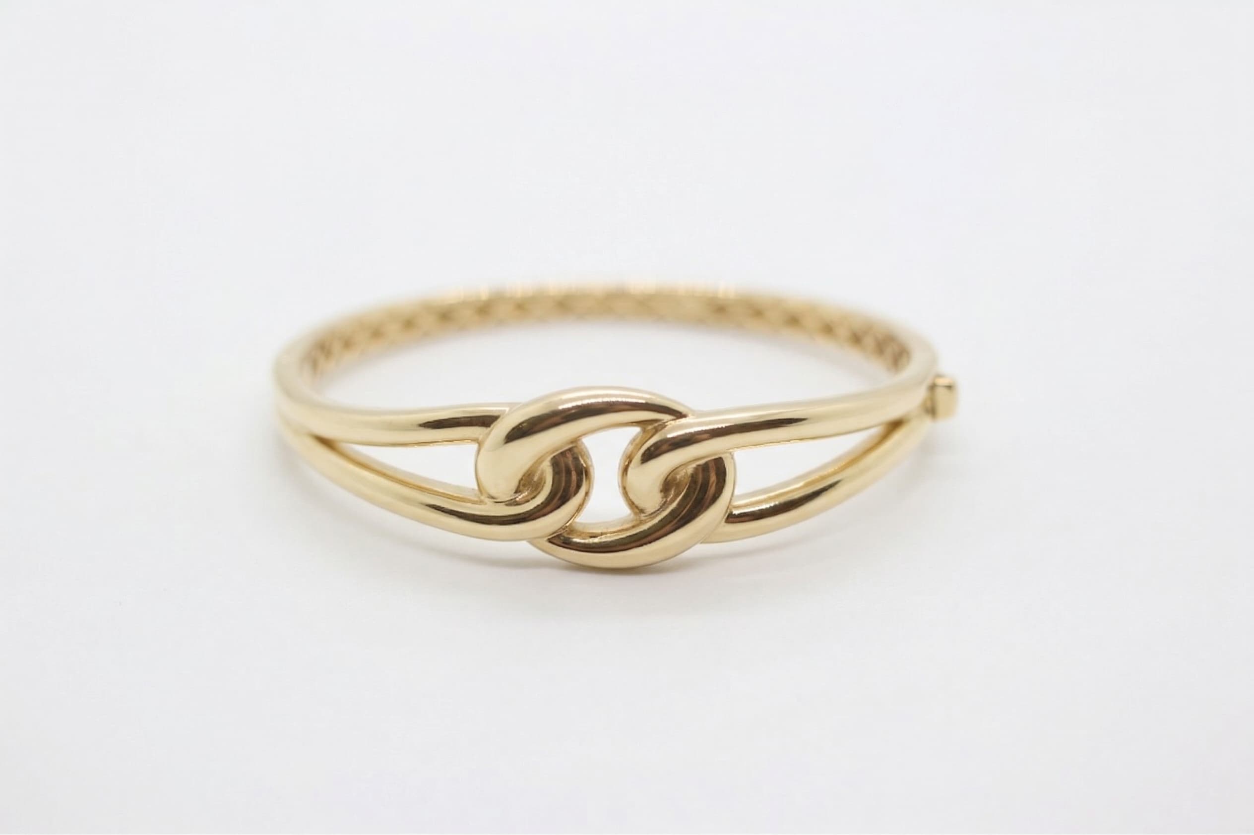 Twist Serisi‘nden bu 14 ayar düğüm motifli altın kelepçe, merkezinde iç içe geçmiş çift halka formunun yarattığı güçlü ve akışkan kompozisyonuyla dikkat çeker. İki halkacığın birbirini kucaklar gibi kenetlendiği bu düğüm motifi, sonsuzluğu, bağlılığı ve birlikteliği simgeler; taşsız sade yapısı ise altının doğal parlaklığını tüm ihtişamıyla ön plana çıkarır.