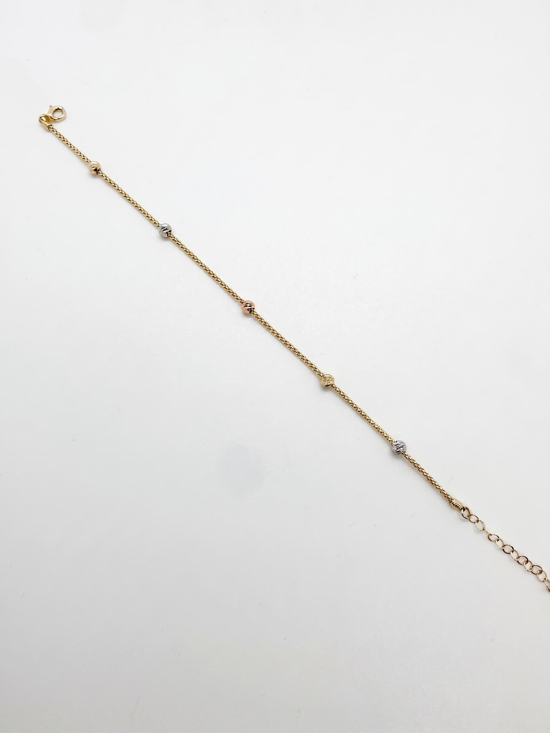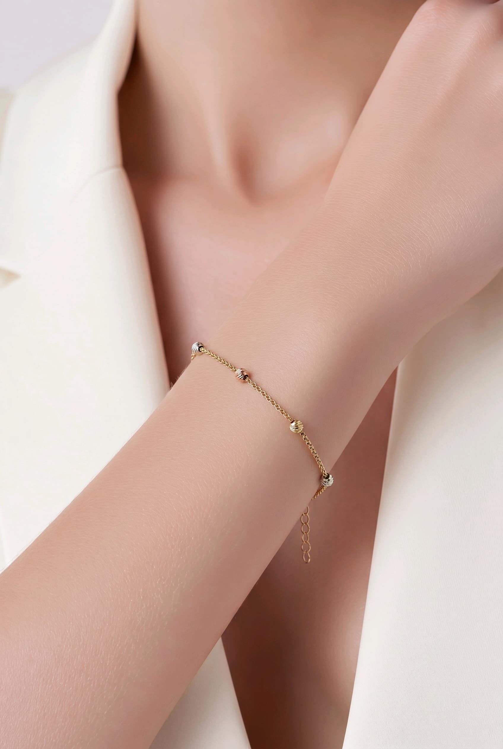 Twist Serisi‘nden bu 14 ayar üç renkli altın bileklik, ince sarı altın zincir üzerinde belirli aralıklarla dizilen sarı, beyaz ve rose altın çentikli boncuklarıyla altının üç farklı tonunu tek bir tasarımda zarif ve dengeli bir şekilde bir araya getirir. Her boncuk, farklı bir ışık yansıması yaratarak bu minimal bilekliğe canlı ve hareketli bir his katar.