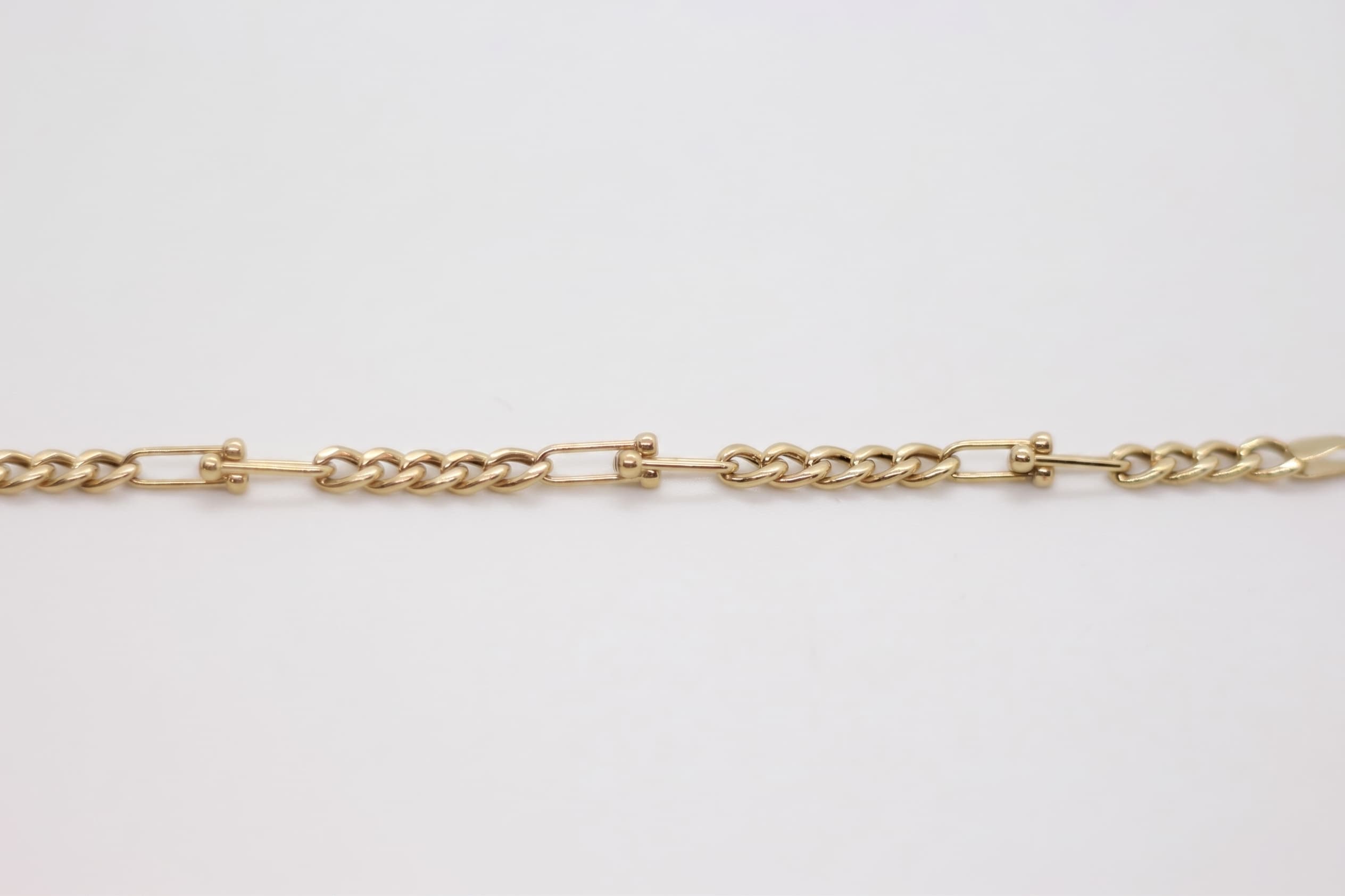 Valor Serisi’nin karakterli parçası olan Valor Figaro, kısa yuvarlak halkaların arasına yerleşen uzun dikdörtgen halkalarla oluşan ritmik yapısıyla figaro altın bileklik formunun en özgün yorumlarından birini sunar. Farklı boyuttaki halkaların dönüşümlü tekrarı, bu bilekliğe monotonluktan uzak, dinamik bir hareket kazandırır.